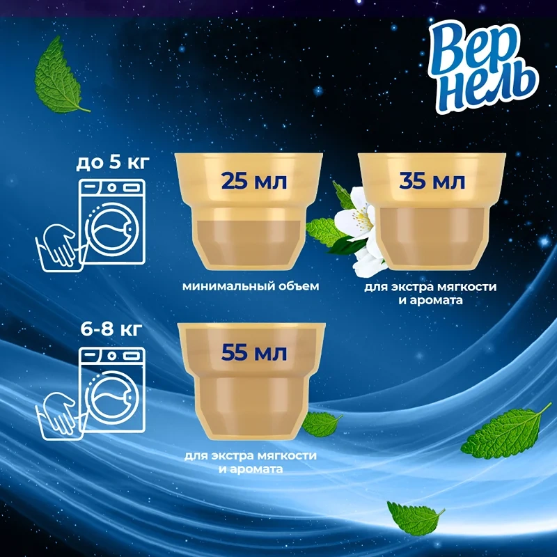 Окружите себя ощущением комфорта и уюта с новинкой от Вернель - концентрированным кондиционером для белья Вернель Ароматерапия Жасмин и Мелисса 1740мл (69 стирок) с ароматами неги и умиротворения, созданными самой природой. В состав парфюмерных композиций входят ароматы трав, традиционно использующиеся для расслабления и успокоения нервной системы Оставляют на белье легкий аромат, длящийся после стирки. Идеально подойдут для стирки постельного белья и одежды для сна. Кондиционер для белья также облегчает глажку и обладает антистатическим эффектом.
