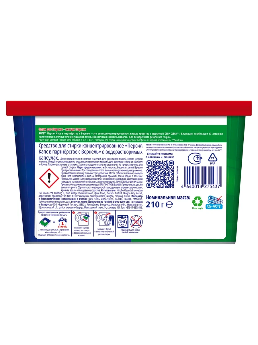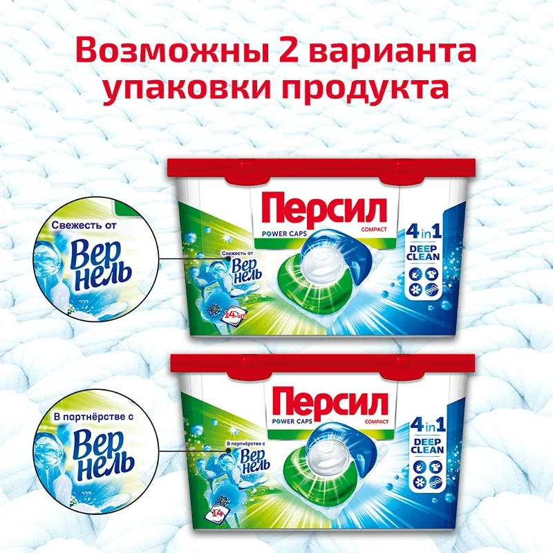 Персил Пауэр Капс 4в1 Свежесть от с Вернель: отстирывают сложные пятна без разводов и утомительных полосканий; эффективны уже при 30С; легко использовать — средство уже правильно дозировано для оптимального результата; подходят для режимов стирки от 40 минут и более; 0% фосфатов и хлорного отбеливателя; 100% водорастворимая пленка.