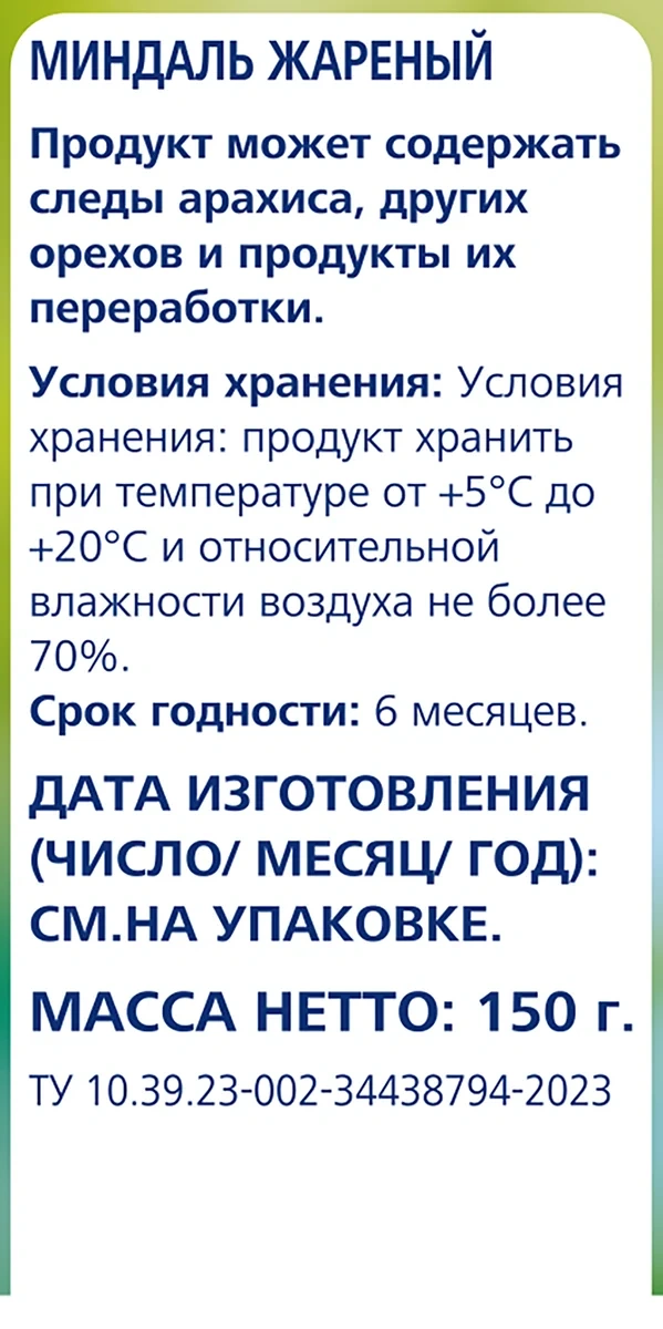 Миндаль METRO CHEF Жареный, 150 г – вкусный и питательный продукт с тонким ароматом. Кроме витаминов, он содержит немало растительного белка, который является хорошей альтернативой животному аналогу. Правильная термообработка делает вкус миндаля более насыщенным, сохраняя большую часть полезных веществ. Жареный миндаль очень популярен среди кулинаров, которые широко используют его для приготовления десертов, соусов и различных лакомств. Также он часто используется в качестве полезного и вкусного перекуса на работе. Благодаря тому, что такой продукт утоляет голод и дает энергию, он незаменим для людей, контролирующих массу своего тела. Кроме того, жареный миндаль – это хорошее дополнение как к обыденному, так и праздничному столу.Бренд: METRO CHEF.Производитель: Metro C&C.Страна: Россия.Тип продукта: орехи.Вид: миндаль.Обработка: жареные.Очистка: очищенные.Вес: 150 г.Калорийность: 635 ккал.Пищевая ценность на 100 г: белки – 19,9 г, жиры – 55,5 г, углеводы – 15 г.Условия хранения: хранить при температуре от +5°С до +20°С.Срок хранения: 12 мес.Вид упаковки: пластиковый пакет.Тип упаковки: вакуумная.Особенности упаковки: флоу-пак.