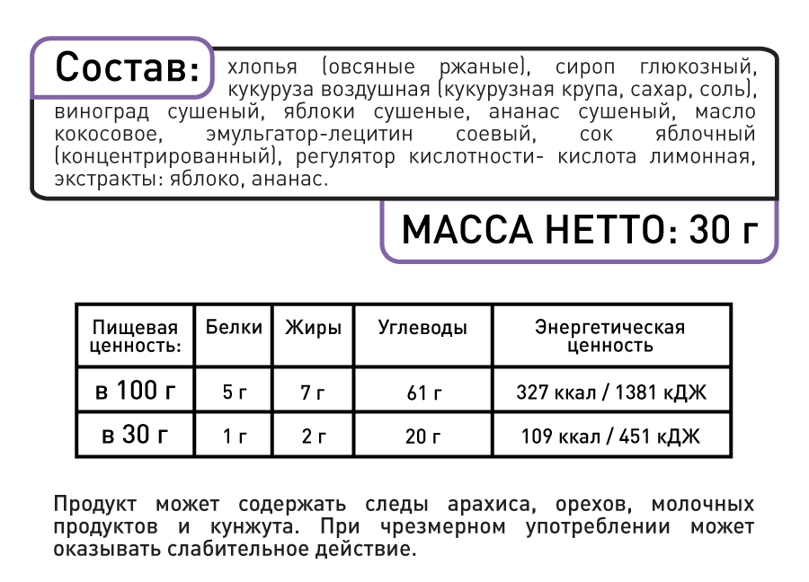 Батончик состоит из натуральных ингредиентов: овсяных и пшеничных хлопьев, экструдированной кукурузы и риса, различных фруктов, ягод и орехов, связанных глюкозно-фруктозным сиропом, натуральным медом или глазурью. Не содержит консервантов, красителей и пальмового масла. Батончик богат клетчаткой, которая является медленным углеводом и очень полезна для пищеварения, витаминами группы B, макро- и микроэлементами (железо, йод, цинк, калий) поэтому идеален для тех, кто следит за питанием. Можно заменить перекус натуральным батончиком-мюсли. Сочный вкус яблока и злаков - это легкий и здоровый перекус в любое время, идеален к чаю и кофе на завтрак. На работе, учебе, в дороге, во время семейной прогулки или встречи с друзьями его удобно взять с собой и насладиться ярким вкусом.