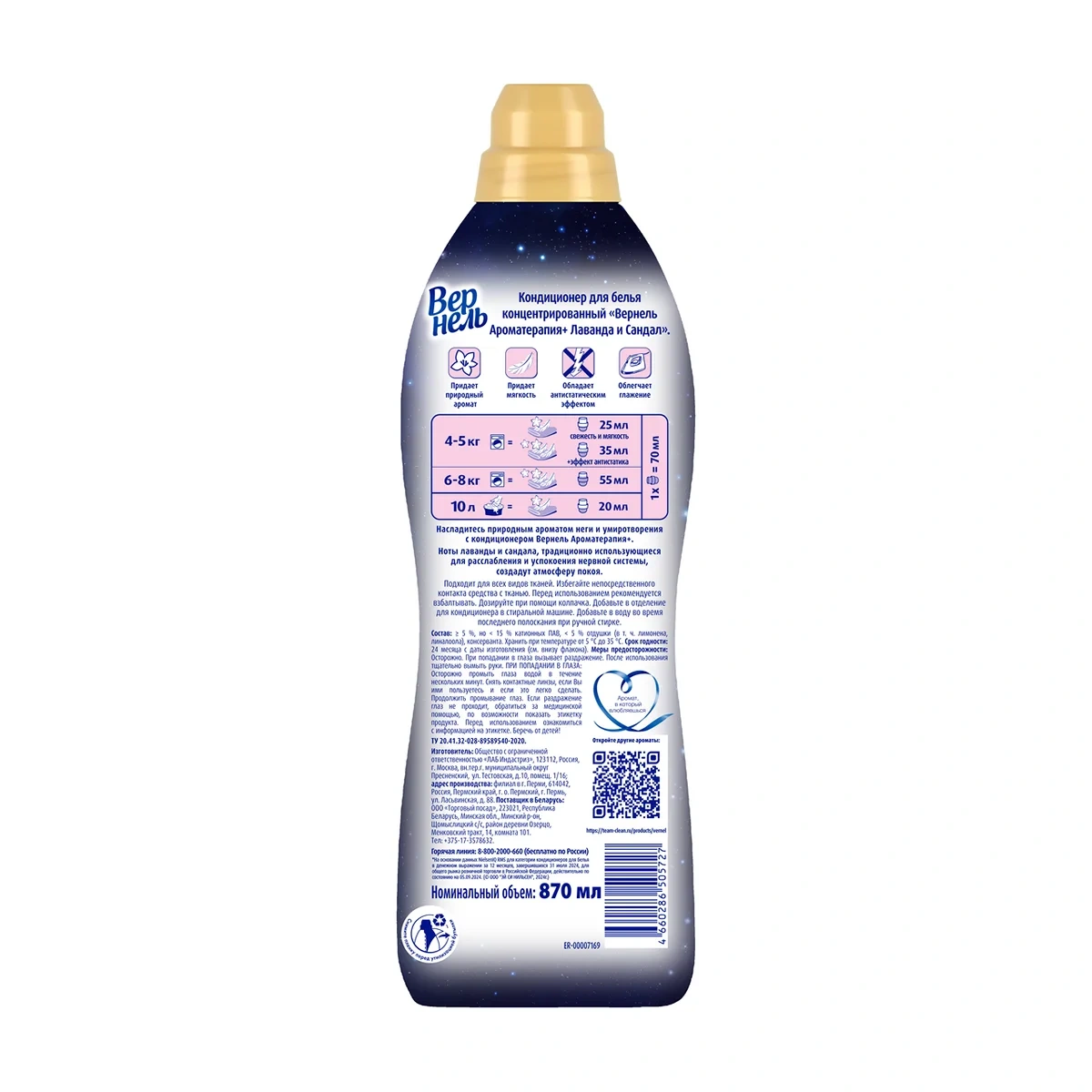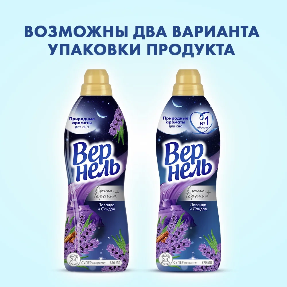 Окружите себя ощущением комфорта и уюта с новинкой от Вернель - концентрированным кондиционером для белья Вернель Ароматерапия Лаванда и Сандал 870мл (34 стирки) с ароматами неги и умиротворения, созданными самой природой. В состав парфюмерных композиций входят ароматы трав, традиционно использующиеся для расслабления и успокоения нервной системы Оставляют на белье легкий аромат, длящийся после стирки. Идеально подойдут для стирки постельного белья и одежды для сна. Кондиционер для белья также облегчает глажку и обладает антистатическим эффектом.