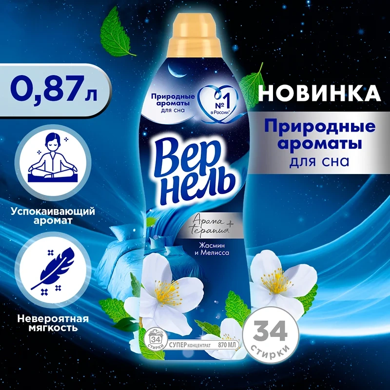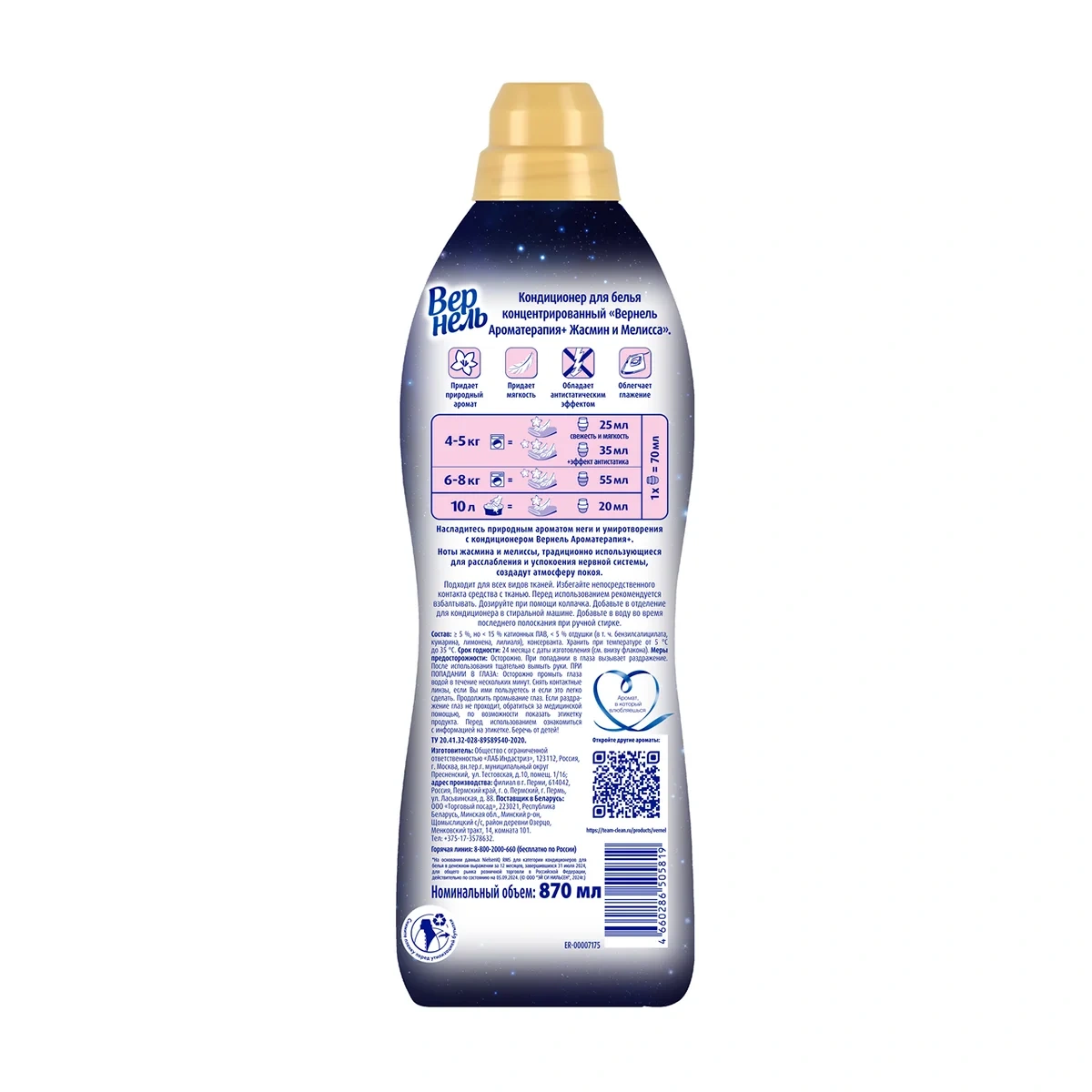 Окружите себя ощущением комфорта и уюта с новинкой от Вернель - концентрированным кондиционером для белья Вернель Ароматерапия Жасмин и Мелисса 870мл (34 стирки) с ароматами неги и умиротворения, созданными самой природой. В состав парфюмерных композиций входят ароматы трав, традиционно использующиеся для расслабления и успокоения нервной системы Оставляют на белье легкий аромат, длящийся после стирки. Идеально подойдут для стирки постельного белья и одежды для сна. Кондиционер для белья также облегчает глажку и обладает антистатическим эффектом.