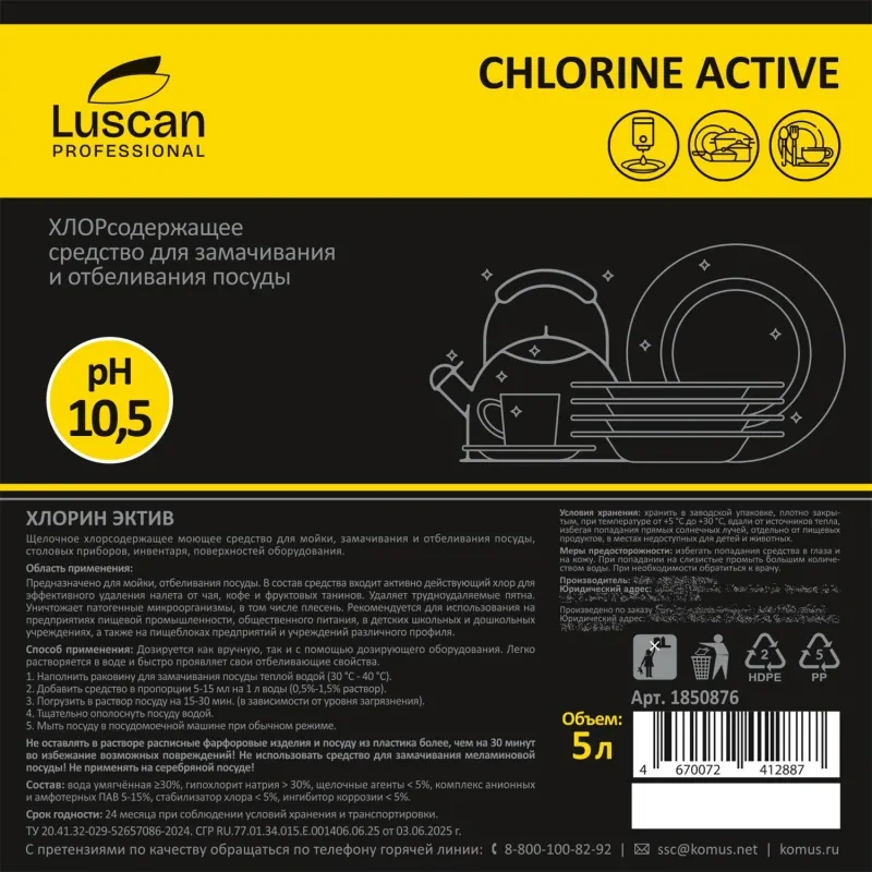 Средство для мытья посуды Luscan Chlorine Active 5л, с хлором