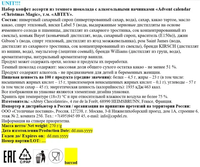 Инвертный сахарный сироп (инвертированный сахар, вода), сахар, какао тертое, масло какао, спирт этиловый, виски Label 5 (вода, выдержанные зерновые дистилляты на основе ячменного солода и пшеницы, дистиллят из сахарного тростника, сок концентрированный из свеклы), коньяк Bayet (коньячный дистиллят, вода, сахарный сироп, краситель (Е150а)), джин Gibson’s (вода, спирт этиловый, дистиллят из ягод можжевельника), ром Saint James (вода, дистиллят из сахарного тростника, сок концентрированный из свеклы), бренди KIRSCH (дистиллят из вишни, вода), эмульгатор (лецитин соевый), бренди Williams (дистиллят из груш, вода), ароматизаторы, натуральный ароматизатор ванили.
