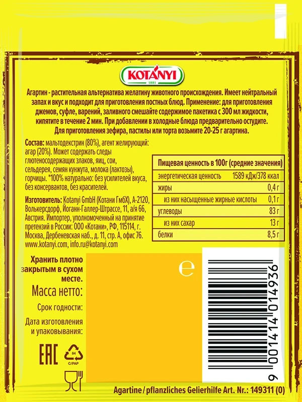 Агар-Агар Kotanyi в пачке 10 г – растительная альтернатива традиционному желатину. Изготавливается из морских водорослей, богатых минеральными элементами и витаминами, необходимыми для молодости и здоровья организма человека. Это низкокалорийный продукт, который можно использовать для приготовления различных легких десертов и постных блюд. Обладает нейтральным вкусом и запахом.