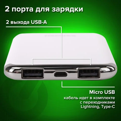 Зарядка электронных устройств от аккумулятора происходит путем подключения устройства к USB-выходу аккумулятора с помощью штатного зарядного кабеля либо с помощью кабеля, поставляемого в комплекте с аккумулятором, или адаптера (в зависимости от типа зарядного интерфейса устройства).