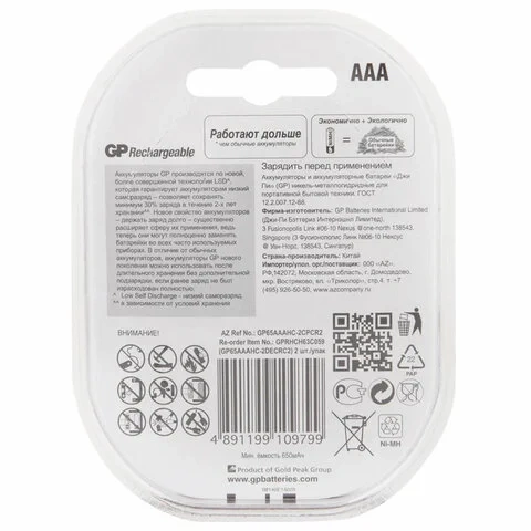 Аккумулятор Gp AAA/HR03, 650мАh, 2шт/уп