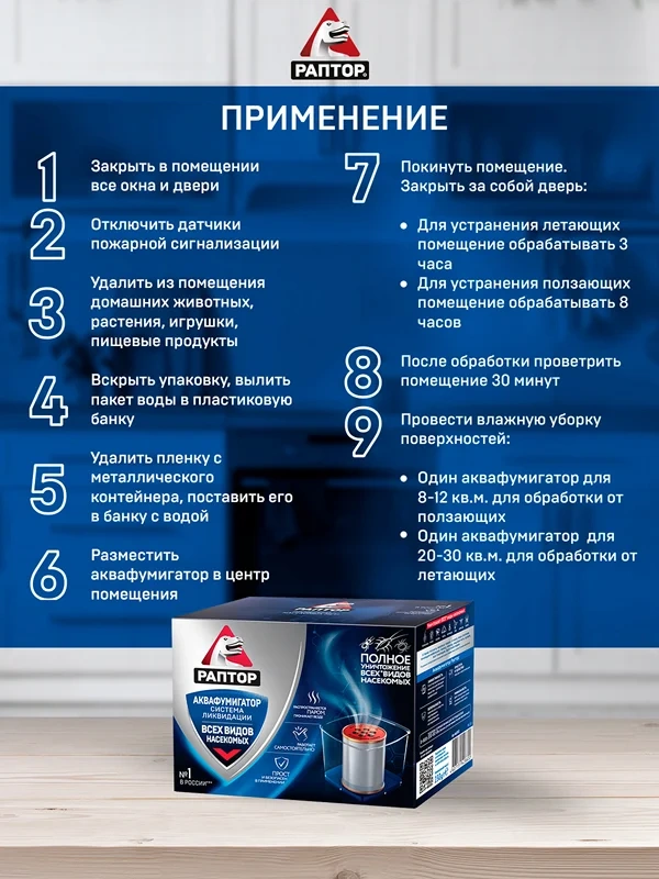 Эффективен против всех видов насекомых – тараканов, мух, комаров, муравьев, блох, а также их яиц. Распространяется паром. Прост в применении и не требует личного присутствия в процессе действия и контроля. В составе высокоэффективное японское действующее вещество cyphenothrin (цифенотрин). Легко проникает в труднодоступные места – под плинтуса, в вентиляционные каналы, в микрощели в полу и в стенах. Эффективность аквафумигатора Раптор от всех видов насекомых подтверждена НИИД Роспотребнадзора РФ. Японское действующее вещество cyphenothrin (цифенотрин) и специальный парообразующий агент помещены внутрь небольшого металлического контейнера, который устанавливается в пластиковую емкость, частично наполненную водой. При контакте с жидкостью начинается интенсивная термическая реакция, в результате которой образуются пары активного вещества, проникающие даже в труднодоступные места. Препарат полностью уничтожает все виды насекомых и их личинки надолго. Действующее вещество Cyphenothrin (цифенотрин) зарекомендовало себя как высокоэффективный нервно-паралитический препарат для уничтожения всех видов насекомых и их личинок, обладающий остаточным действием, что обеспечивает продолжительный эффект. Цифенотрин – инсектицид широкого спектра, безопасный для человека и домашних животных.