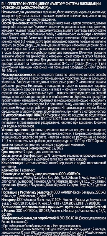 Аквафумигатор Раптор Система ликвидации насекомых, 210г