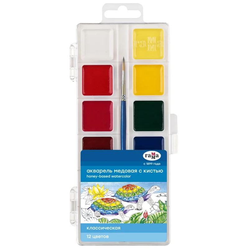 Акварель Гамма 'Классическая', медовая, 12 цветов, с кистью, пластик. упак., европодвес NEW