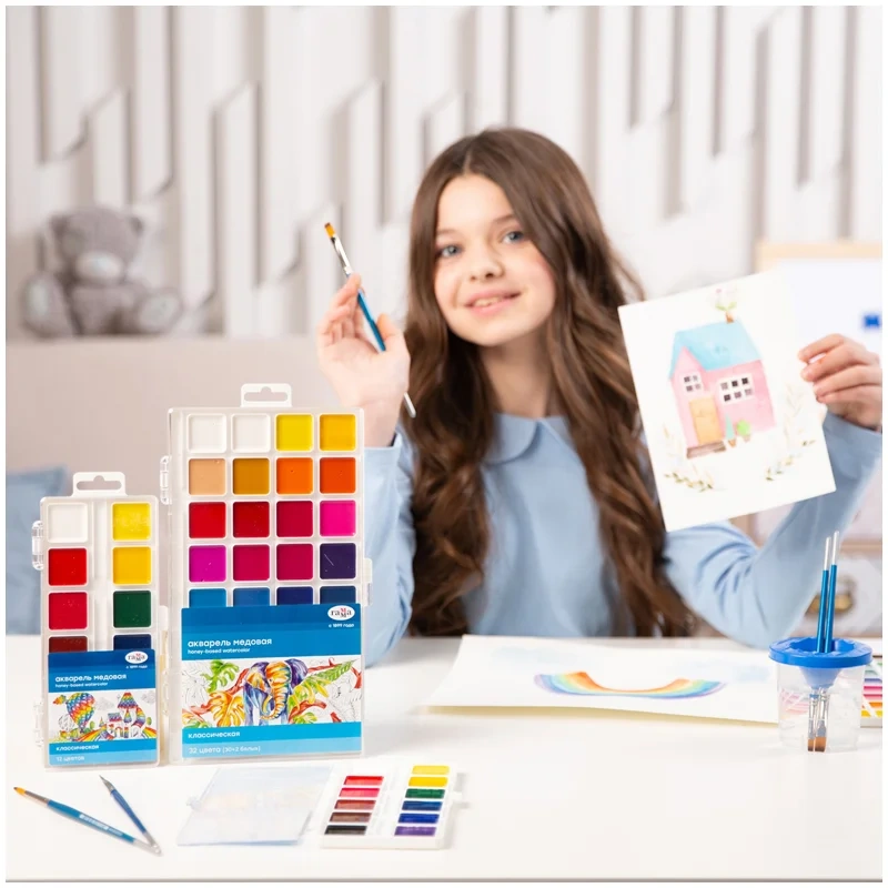 Медовая полусухая акварель ГАММА серии «Классическая» разработана для использования в школе и дома. Естественные цвета акварели обучают правильному цветовосприятию окружающего мира. Краски изготовлены на основе органических пигментов и натурального связующего. Прозрачность красок, яркость и чистота цвета, разносимость и размываемость — основные характеристики акварели данной серии. Кюветы с высокими бортиками и увеличенным расстоянием между красками предназначены для удобства в работе детей. Палитра для смешивания красок расположена на крышке. Акварель легко смывается с рук и отстирывается с одежды. Яркие краски 32 цветов разделены надёжными кюветами, благодаря которым цвета не смешаются при работе.