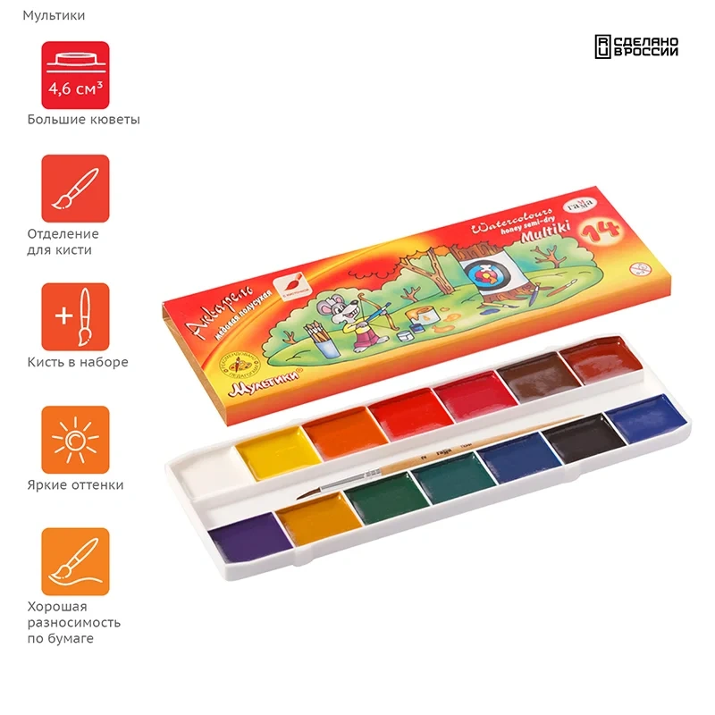 Акварель Гамма Мультики 14 цветов, медовая, с кистью