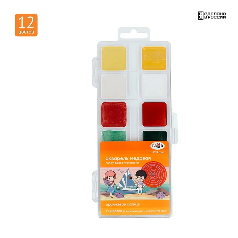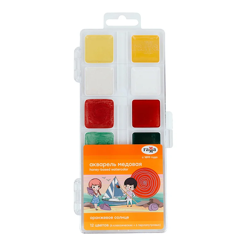 Акварель Гамма 'Оранжевое солнце', медовая, 12 цветов (6 перламутр.+ 6 классич.), без кисти, пластик
