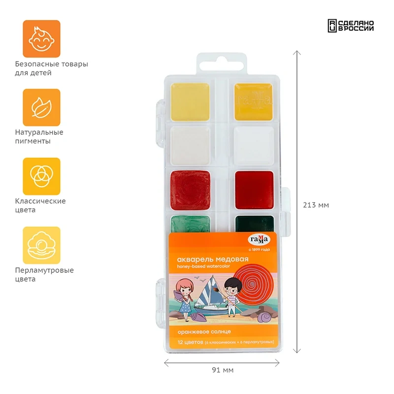 Медовая акварель «Оранжевое солнце» имеет расширенную палитру цветов, включающую классические цвета и цвета с различными эффектами. В наборе: 6 классических и 6 перламутровых цветов. «Волшебные» цвета дают возможность проявить фантазию и создать любой сказочный сюжет. Краски нетоксичны, легко смываются с рук и отстирывается с одежды, хорошо смешиваются. Кюветы с высокими бортиками и увеличенным расстоянием между красками предназначены для удобства в работе детей. Палитра для смешивания красок расположена на крышке. Объем кювет - 3,14 см3. Форма кювет - квадратная.