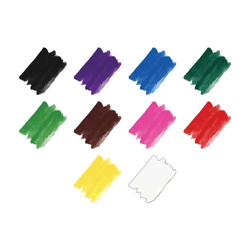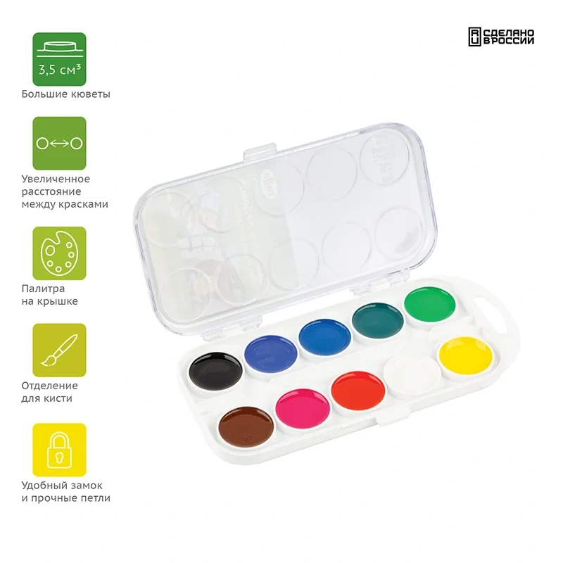 Кюветы с высокими бортиками и увеличенным расстоянием между красками предназначены для удобства в работе детей. Палитра для смешивания красок расположена на крышке. Акварель легко смывается с рук и отстирывается с одежды.