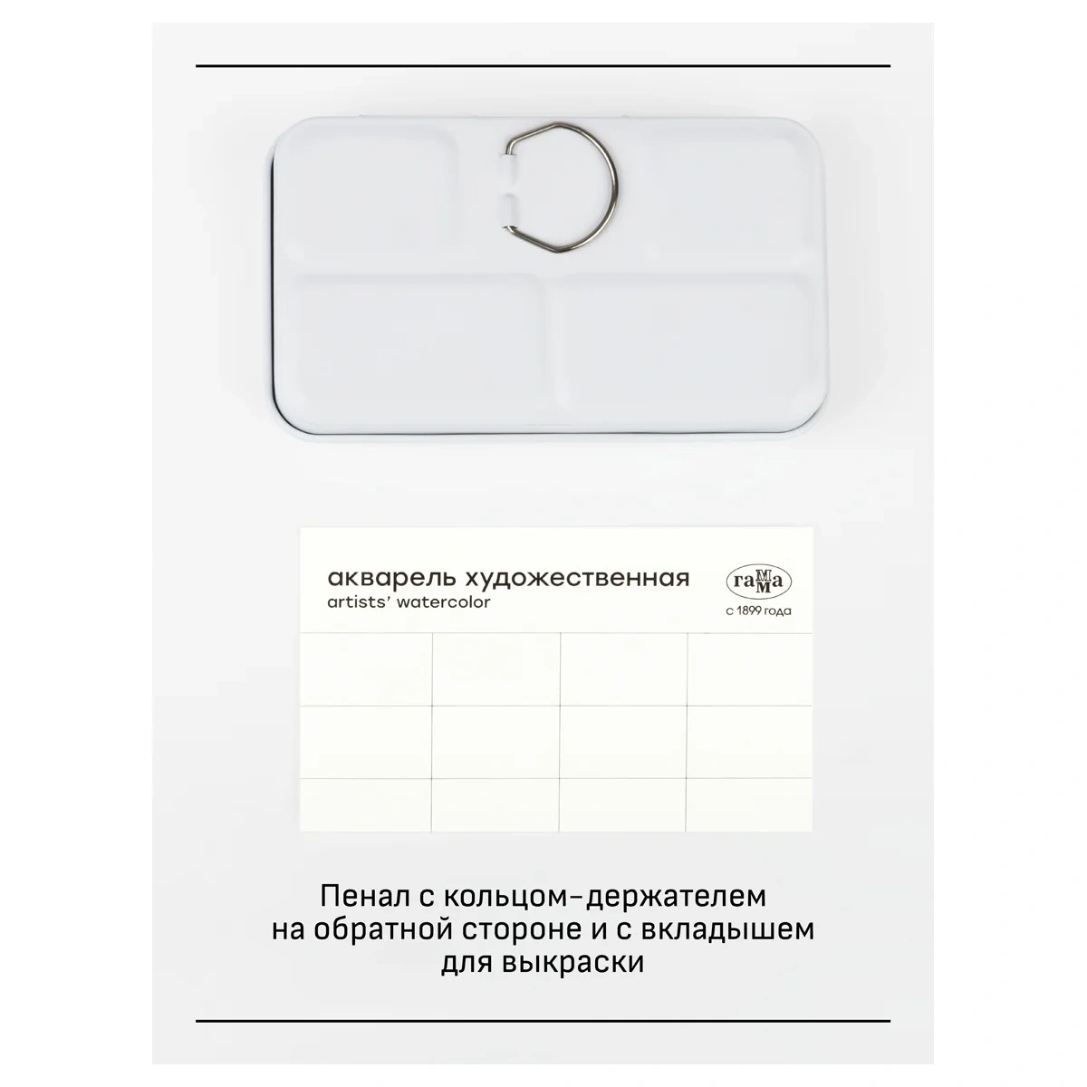 Набор представлен в металлическом пенале с удобными креплениями кювет, палитрой и кольцом-держателем на обратной стороне. Такой формат удобен для пленэра или студии. Иллюстрация для упаковки предоставлена Ильей Ибряевым.