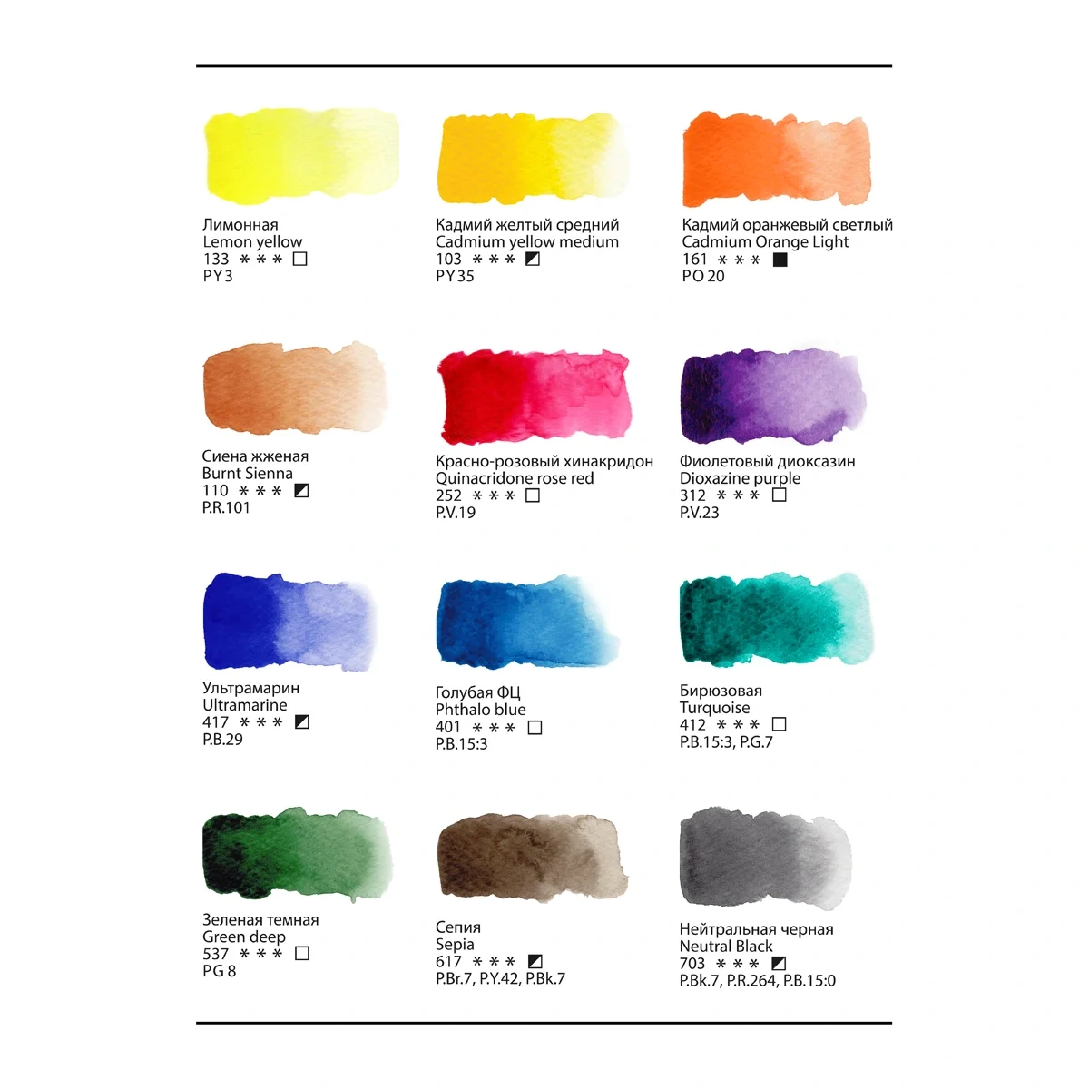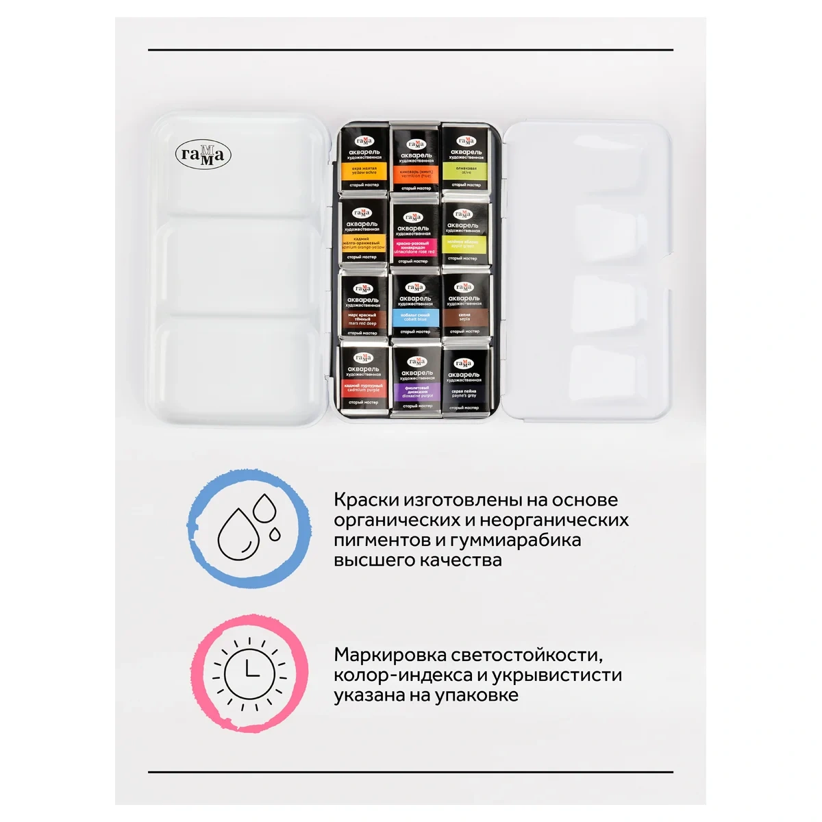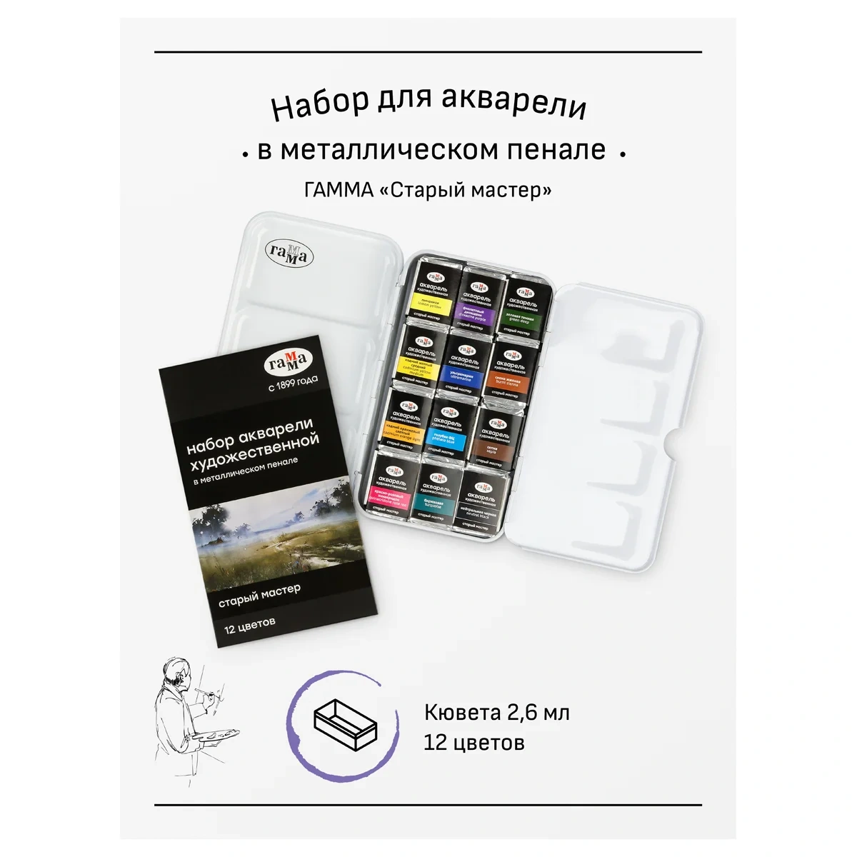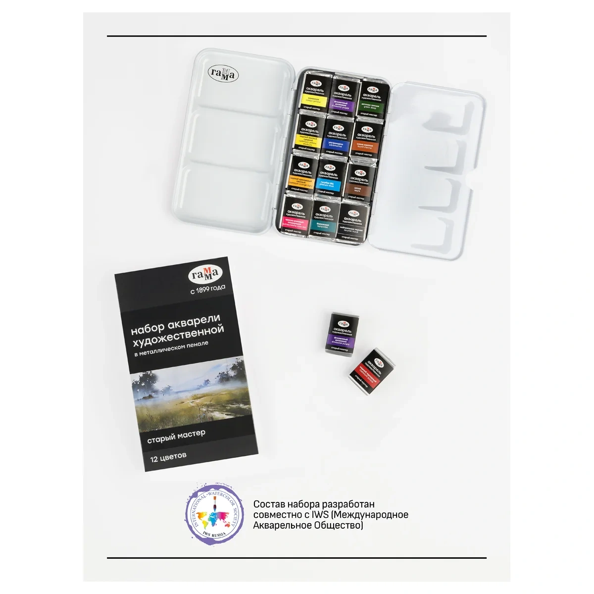 Акварель Гамма Старый Мастер 12 цветов, кюветы, металлическая коробка