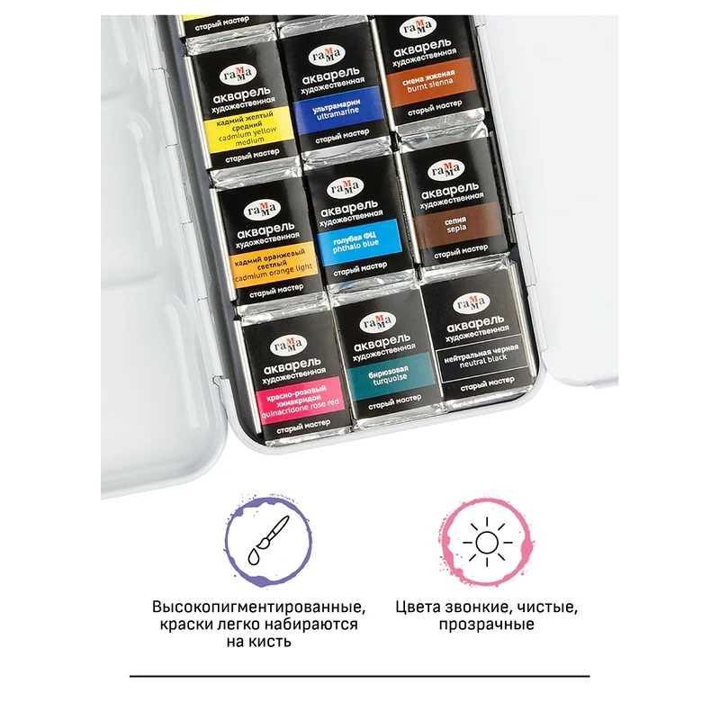 Профессиональная художественная акварель «ГАММА» серии «Старый мастер» разработана в собственной исследовательской лаборатории завода. Профессиональные краски состоят из тонкодисперсных пигментов, связующего, в состав которого входит раствор растительного клея - гуммиарабика высшей степени очистки, что обеспечивает насыщенность цветов, чистоту и прозрачность красочного слоя. Акварель «Старый мастер» изготавливается без использования дополнительных наполнителей, а многослойная заливка увеличивает долю пигмента. Краски обладают высоким уровнем светостойкости. С помощью акварельных красок «ГАММА» серии «Старый мастер» можно писать в различных техниках, например, - лессировка, по - мокрому, заливка, сухая кисть.