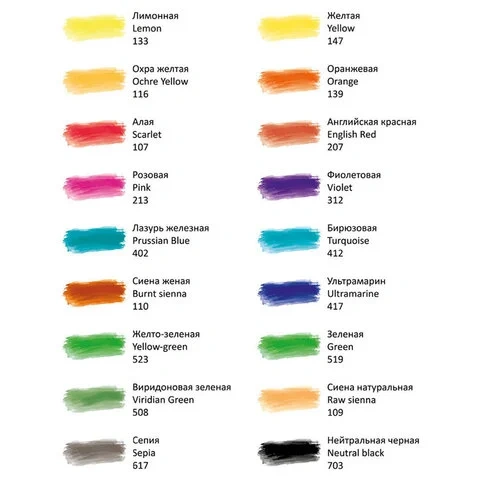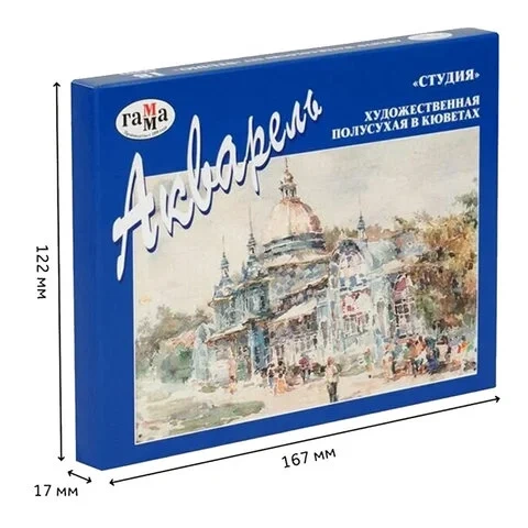 Акварельные краски серии «Студия» изготовлены на основе гуммиарабика. Полусухая акварель сушится при температуре не выше 40 °C, что позволяет сохранить яркость и свежесть краски. После высыхания она становится матовой. Цвета легко смешиваются между собой, прекрасно размываются и легко набираются из кюветы. Набор из 18 цветов акварельных красок идеально подойдёт для начинающих художников и студентов художественных училищ. Кювета 2,6 мл.