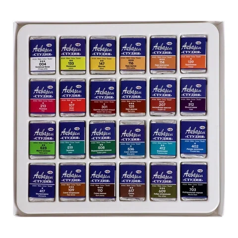 Акварельные краски серии «Студия» изготовлены на основе гуммиарабика. Полусухая акварель сушится при температуре не выше 40 °C , что позволяет сохранить яркость и свежесть краски. После высыхания она становится матовой. Цвета легко смешиваются между собой, прекрасно размываются и легко набираются из кюветы. Набор из 24 цветов акварельных красок идеально подойдёт для начинающих художников и студентов художественных училищ. Кювета 2,6 мл.