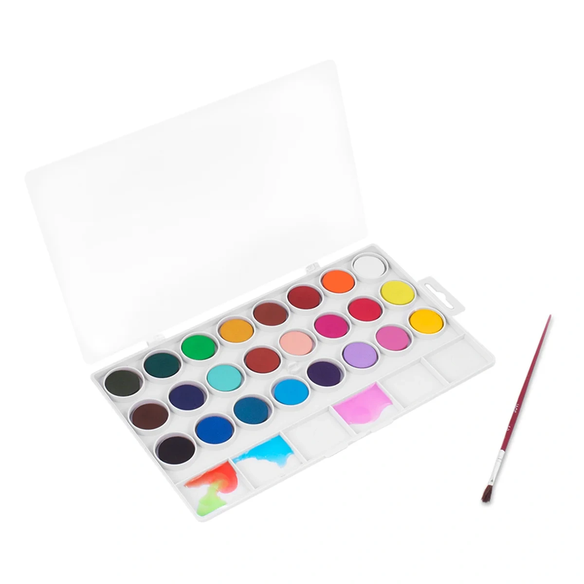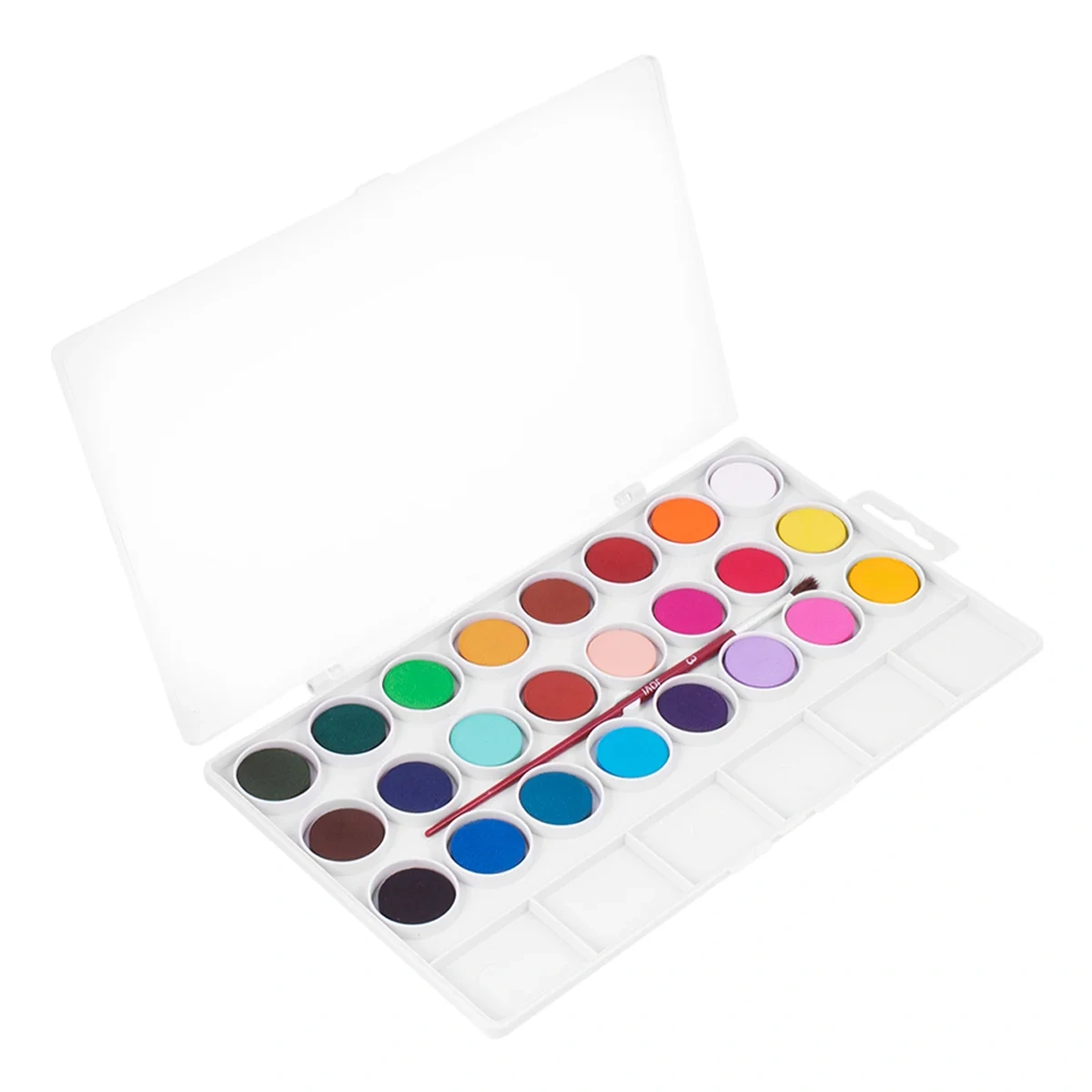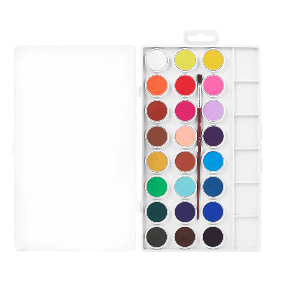 Высококачественная акварель для рисования дома, в школе, в художественных студиях, подходит для разных техник рисования. 24 цвета. Краски в коробке с кюветами для воды и кистью. Спрессованные таблетки диаметром 22 мм (вес 2,9 г) с высоким содержанием пигмента. Гораздо более экономичные, чем полусухая акварель в кюветах. Легко разводятся: при добавлении небольшого количества воды цвета получаются очень насыщенными и яркими, а увеличение количества воды приводит к эффектам, типичным для техники акварели. Хорошо ложатся на поверхность. Могут использоваться для рисования на различных поверхностях: бумаге различной плотности, картоне, для раскрашивания просохших фигурок из пасты для лепки, застывающей на воздухе, или из папье-маше. Краски отстирываются с большинства видов тканей. Страна производства Испания.
