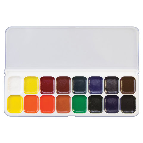Цвета: белила, желтый, лимонный, оранжевый, алый, розовый, бордо, фиолетовый, синий, лазурно-голубой, желто-зеленый, изумрудно-зеленый, зеленый, охра красная, коричневый, черный.