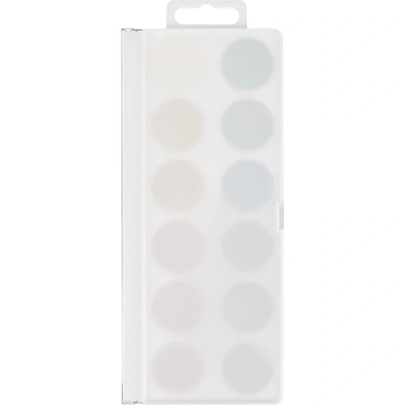 Набор размещён в пластмассовом пенале с прозрачной крышкой. Кюветы круглой формы. Размер упаковки — 200×81×12 мм. Кисточка в комплект не входит.