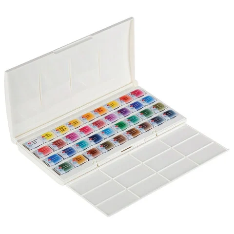 Кюветы по 2.5 мл упакованы в пластиковую коробку с откидной палитрой. Коробка удобна для переноса и использования вне студии. Краски обеспечивают максимальную интенсивность цвета. Их насыщенность сохраняется даже при разбавлении водой.