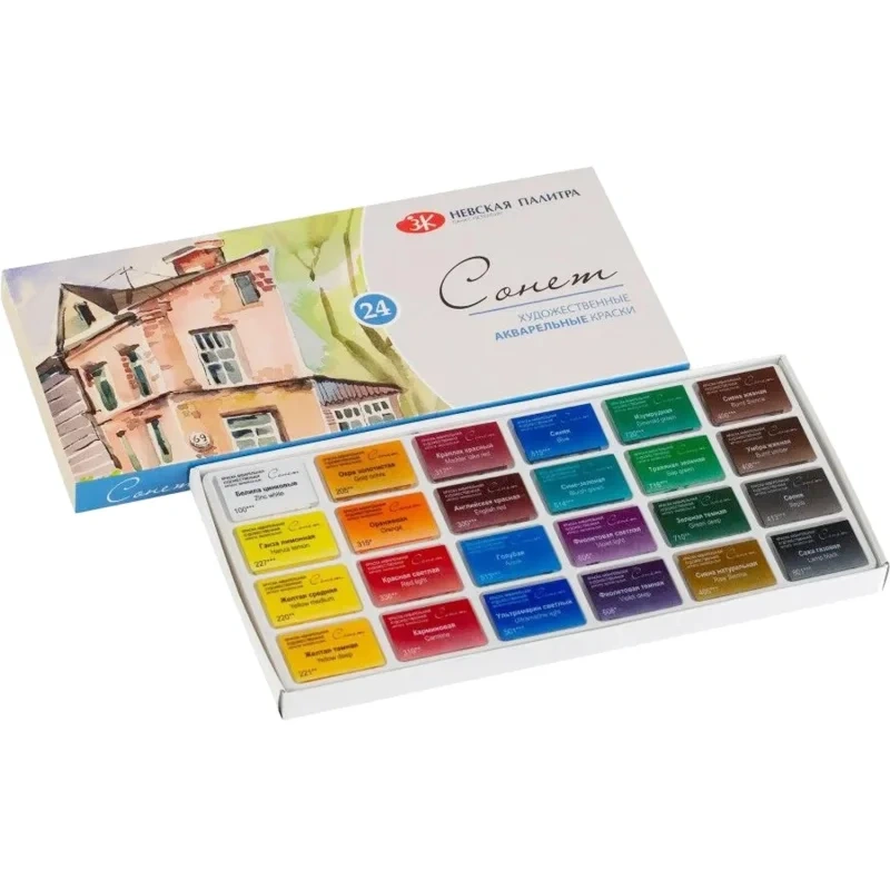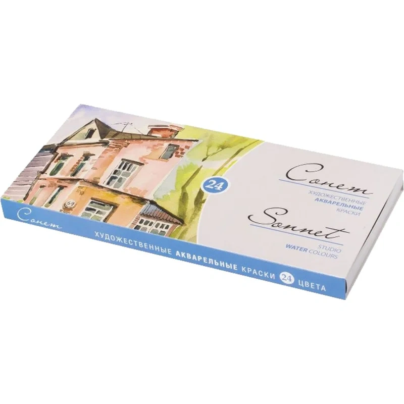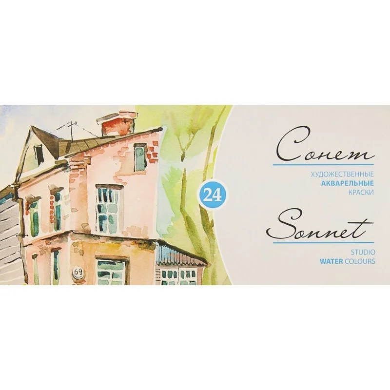Набор акварельных красок Сонет включает 24 цвета. В набор входят следующие цвета: белила цинковые, ганза лимонная, жёлтая средняя, жёлтая тёмная, охра золотистая, оранжевая, красная светлая, карминовая, краплак красный, английская красная, голубая, ультрамарин светлый, синяя, сине-зелёная, фиолетовая светлая, фиолетовая тёмная, изумрудная, травяная зелёная, зелёная тёмная, сиена натуральная, сиена жжёная, умбра жжёная, сепия, сажа газовая.