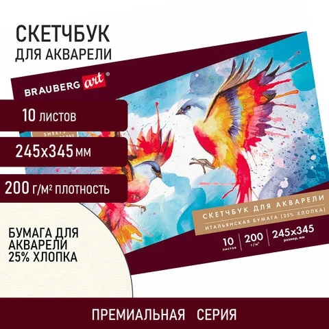 Альбом для акварели, бумага ИТАЛИЯ 200 г/м2, 25% хлопок, 245х345 мм, 10 л., BRAUBERG ART 'PREMIERE',
