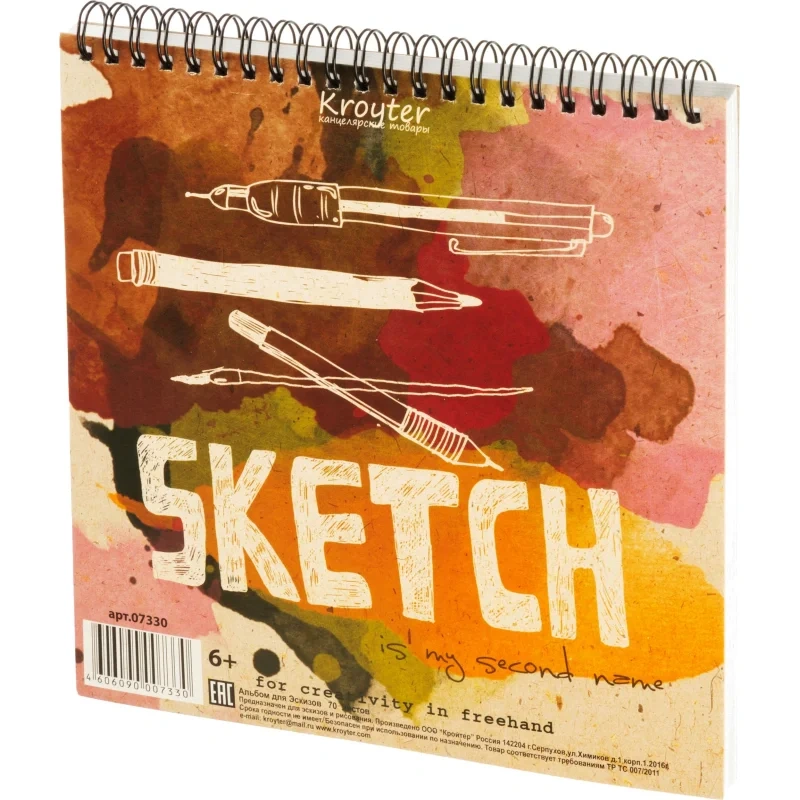 Альбом для эскизов формата 200?200 мм 70 листов серии «Эко» на спирали по верхней стороне. Обложка — высококачественный картон 215 гр/м, многокрасочная печать. Внутренний блок — белая, высокого качества бумага 90 гр/м. Альбом предназначен для эскизов и зарисовок, при использовании по назначению безопасен. Произведено в России. Соответствует требованиям ТР ТС 007/2011.