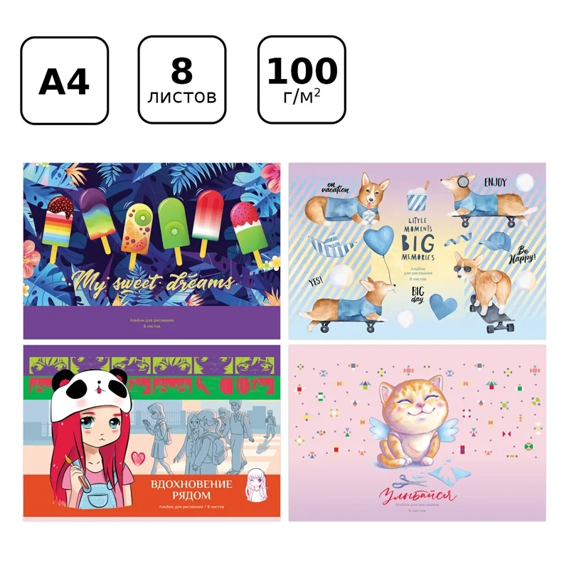 Альбом для рисования BG «MIX.Девочки» поставляется с ассорти дизайнов формата А4 и размера 205*295 мм. Товар с обложкой из плотной мелованной бумаги плотностью 170 гр/м2 из 8 листов офсетной бумаги 90% белизны. Тип скрепления изделия – скрепка. Плотность бумаги альбома составляет 100 г/кв.м, что соответствует техническому регламенту «О безопасности продукции, предназначенной для детей и подростков». Альбом с дизайном для девочек отлично подходит для рисования различными типами красок, фломастерами, цветными и чернографитными карандашами, гелевыми ручками. Без возрастных ограничений.
