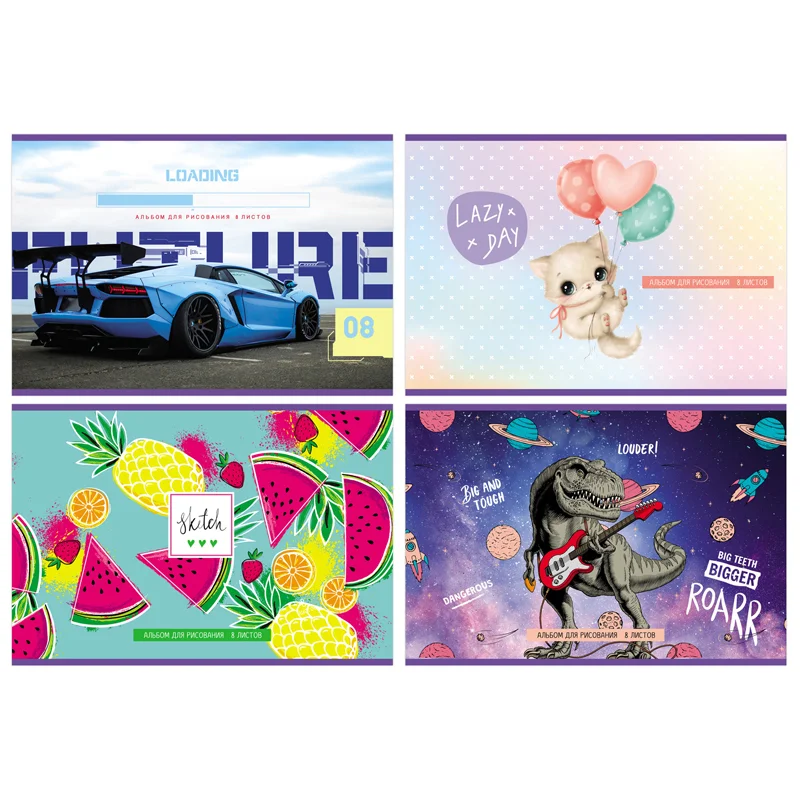 Альбом для рисования BG «MIX.Универсальный» поставляется с ассорти дизайнов формата А4 и размера 205*295 мм. Товар с обложкой из плотной мелованной бумаги плотностью 170 гр/м2 из 8 листов офсетной бумаги 90% белизны. Тип скрепления изделия – скрепка. Плотность бумаги альбома составляет 100 г/кв.м, что соответствует техническому регламенту «О безопасности продукции, предназначенной для детей и подростков». В данную серию входят дизайны как для мальчиков, так и для девочек. Альбом отлично подходит для рисования различными типами красок, фломастерами, цветными и чернографитными карандашами, гелевыми ручками. Без возрастных ограничений.