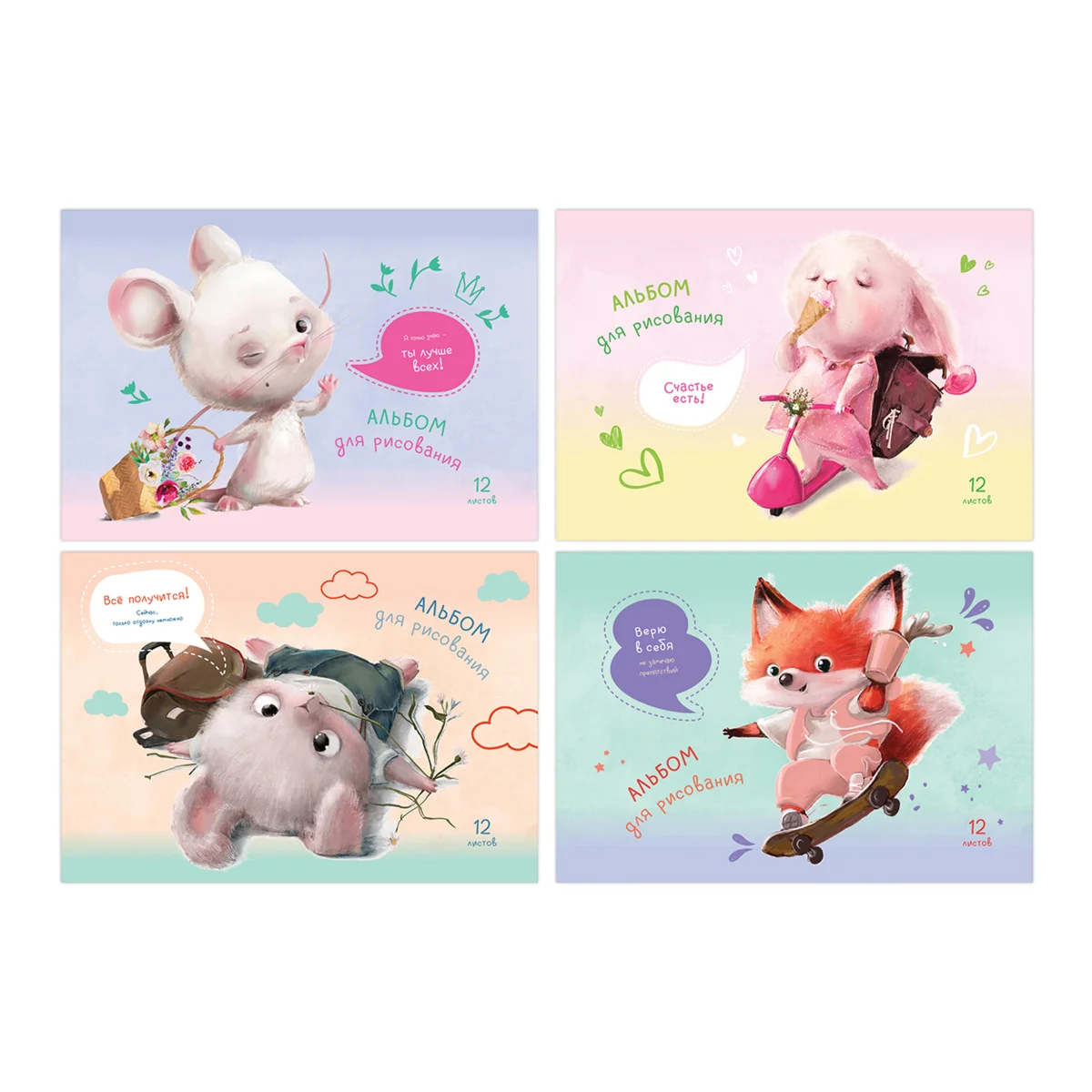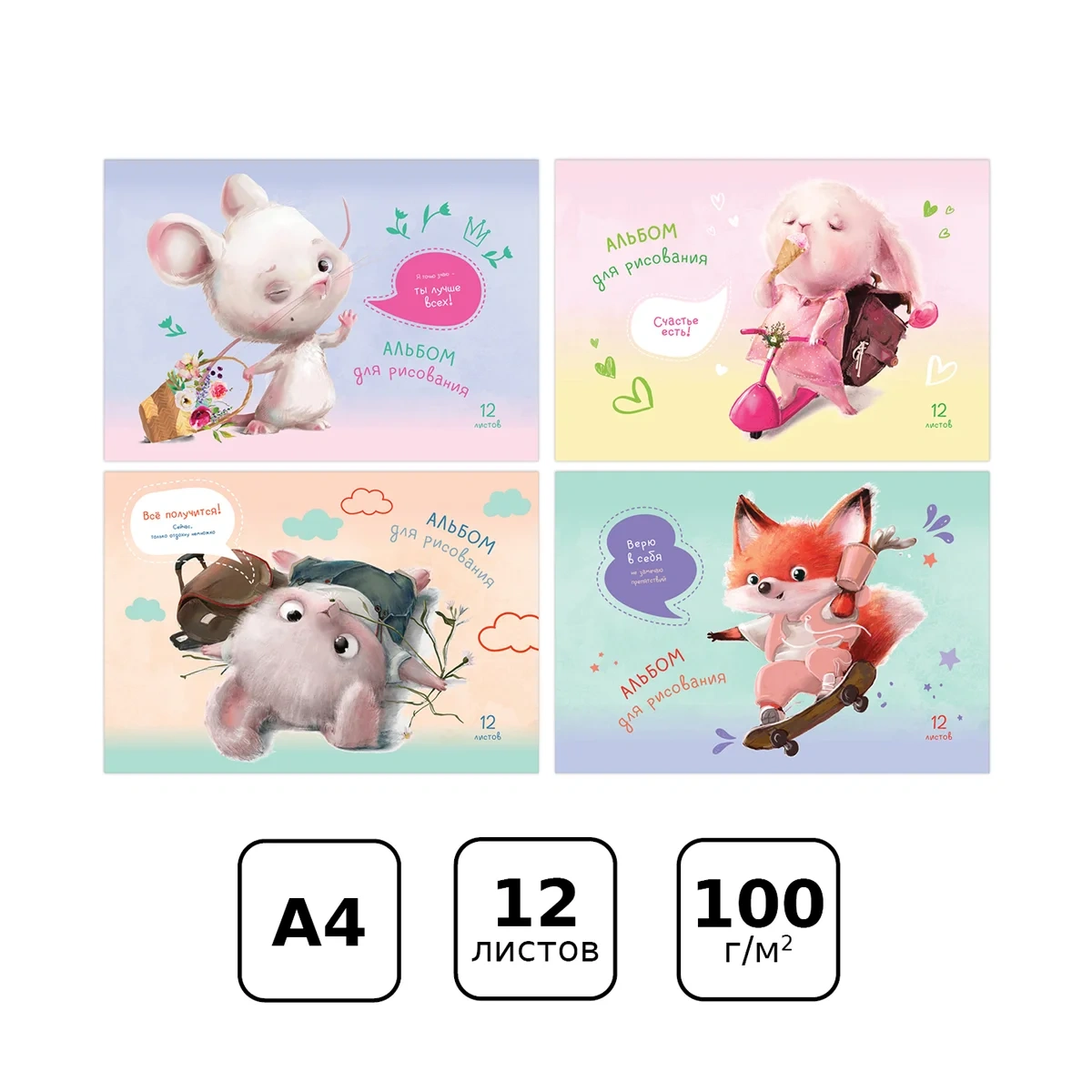 Альбом для рисования BG «Зверомотиватор» поставляется в ассорти дизайнов формата А4 и размера 205*295 мм. Товар с обложкой из мелованного картона из 12 листов офсетной бумаги 100% белизны. Тип скрепления изделия – скрепка. Плотность бумаги альбома составляет 100 г/кв.м, что соответствует техническому регламенту «О безопасности продукции, предназначенной для детей и подростков». В данную серию входят дизайны, которые подойдут и для девочек, и для мальчиков. Альбом отлично подходит для рисования различными типами красок, фломастерами, цветными и чернографитными карандашами, гелевыми ручками. Без возрастных ограничений.