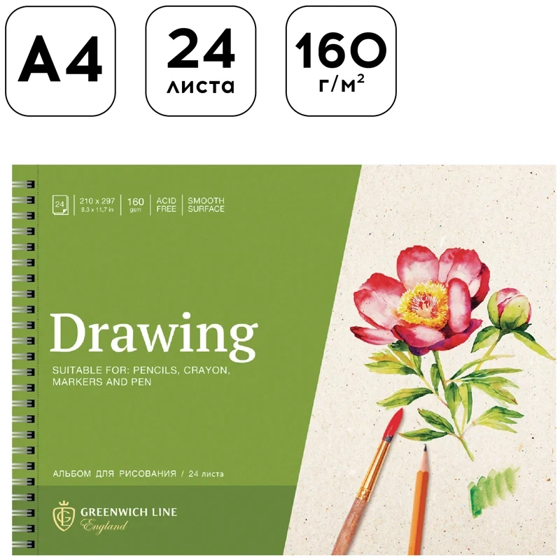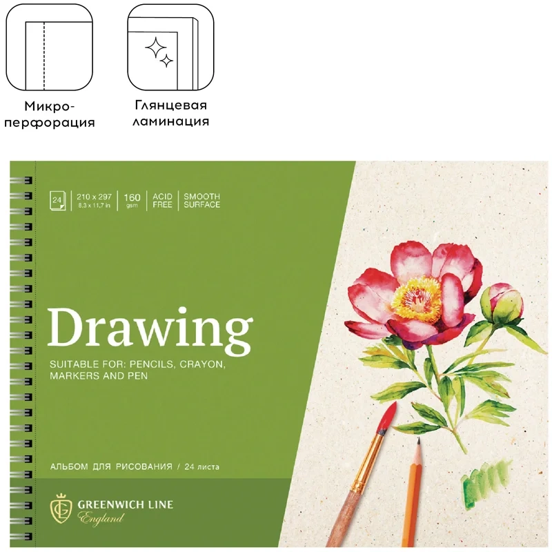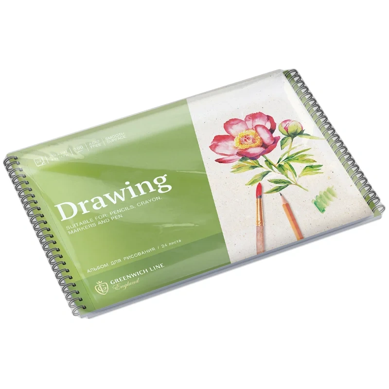 Альбом для рисования Greenwich Line Botanical. Peony формата А4 размером 203*285 мм с обложкой из импортного чистоцеллюлозного картона состоит из 24 листов офсетной бумаги на гребне. Каждый лист имеет перфорацию в корешке, что позволяет легко и аккуратно оторвать лист. Плотность бумаги составляет 160 г/м2.