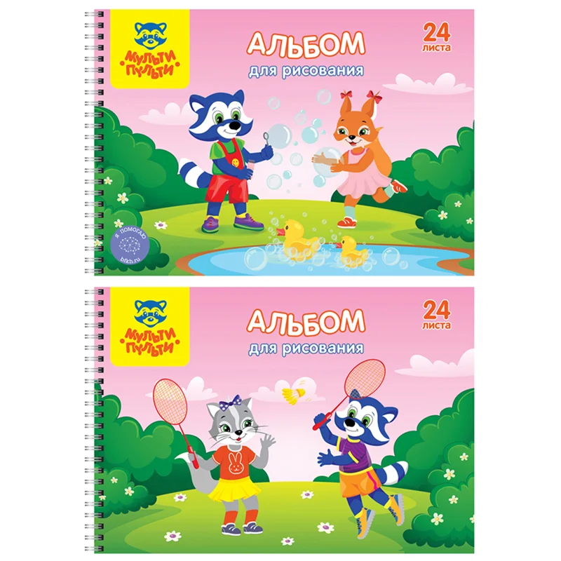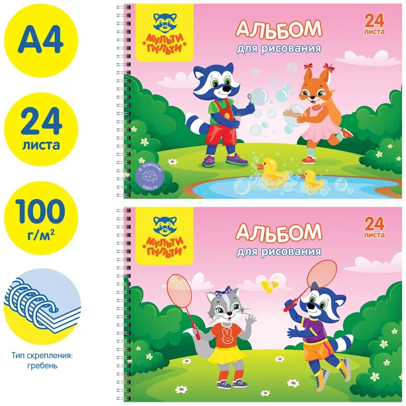 Альбом для рисования формата А4, на гребне. Обложка изготовлена из импортного мелованного картона. На обороте обложки напечатаны картинки для раскрашивания. Внутренний блок из 24 листов офсетной бумаги плотностью 100 г/кв.м, соответствует Техническому регламенту «О безопасности продукции, предназначенной для детей и подростков». Подходит для рисования различными типами красок, фломастерами, цветными и чернографитными карандашами, гелевыми ручками. Без возрастных ограничений.