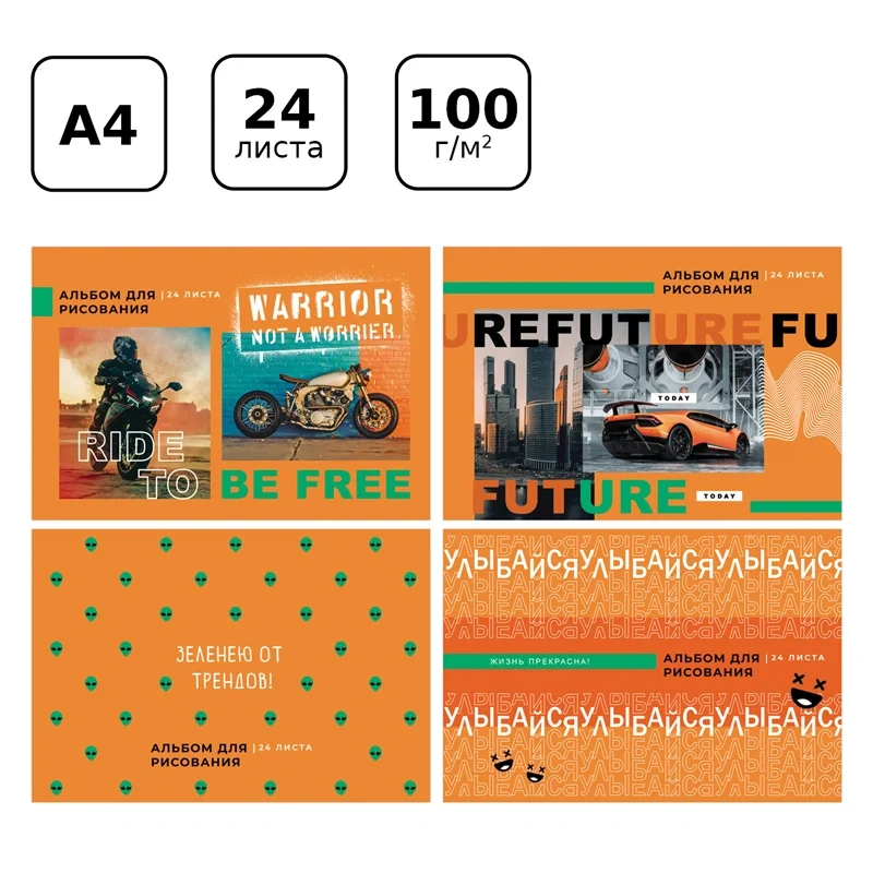 Альбом для рисования BG 'Orange Drive' поставляется с ассорти дизайнов формата А4 и размера 205*295 мм. Товар с обложкой из высококачественного мелованного картона состоит из 24 листов офсетной бумаги 100% белизны. Тип скрепления изделия – скрепка. Плотность бумаги альбома составляет 100 г/кв.м, что соответствует техническому регламенту «О безопасности продукции, предназначенной для детей и подростков». Альбом с мужским дизайном отлично подходит для рисования различными типами красок, фломастерами, цветными и чёрно-графитными карандашами, гелевыми ручками. Без возрастных ограничений. • Вид товара: альбом для рисования;