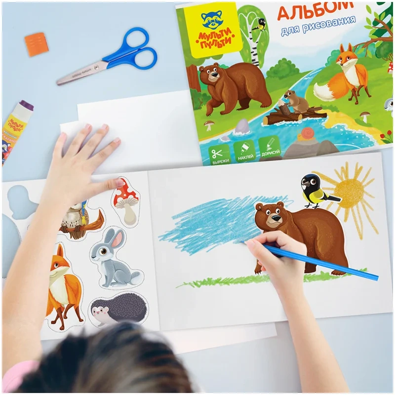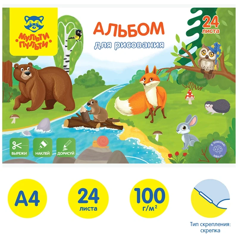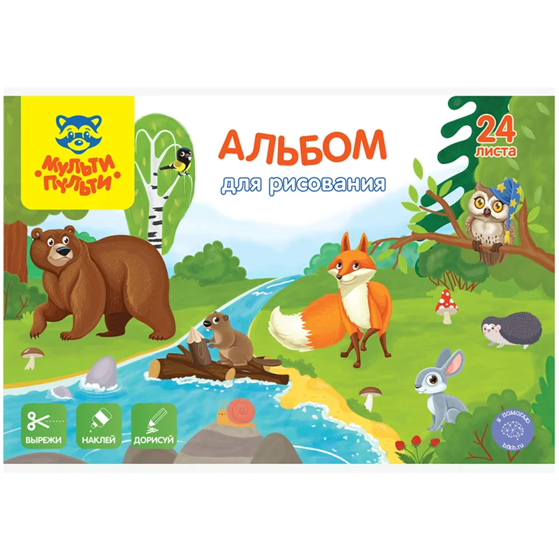 Альбом для рисования 24л., А4, на скрепке Мульти-Пульти 'Вырежи, наклей, дорисуй. Звери'