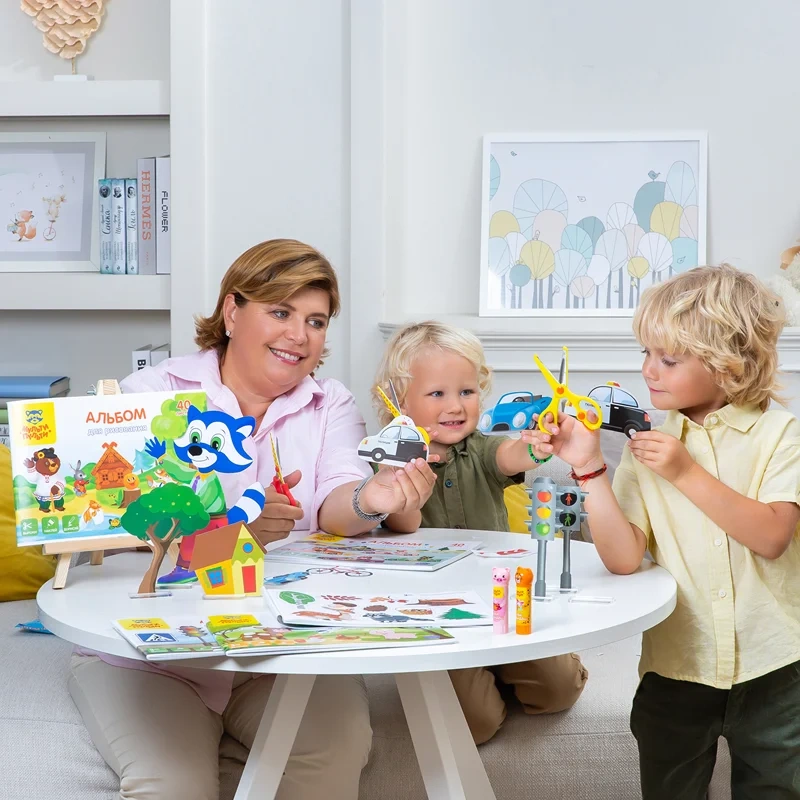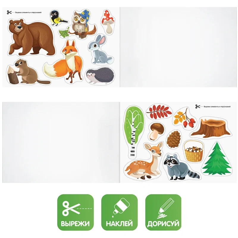В альбоме представлены тематические элементы и персонажи (лесные животные) для вырезания, которые можно использовать по отдельности или сразу вместе. Ребёнок может придумать сюжетную игру с рисунками и наклейками, украсить поделки, подарки для близких или детскую комнату. Размер ? 205*285 мм. Обложка изготовлена из импортного мелованного картона. Внутренний блок из 24 листов офсетной бумаги плотностью 100 г/кв. м, соответствует Техническому регламенту «О безопасности продукции, предназначенной для детей и подростков».