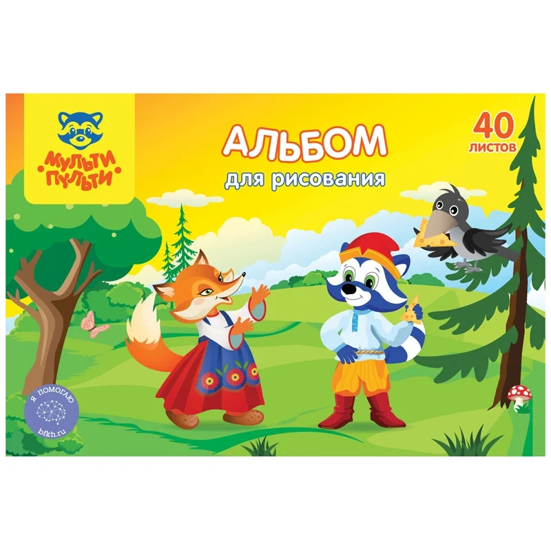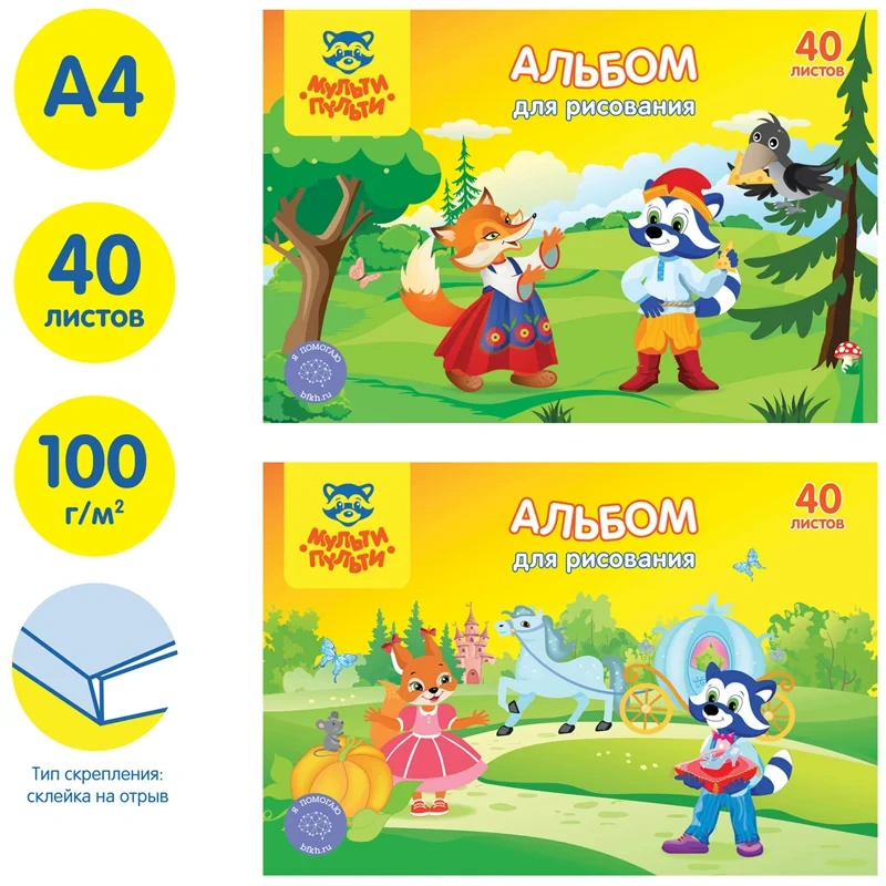 Альбом для рисования Мульти-Пульти формата А4 в картонной обложке. Состоит из 40 листов офсетной бумаги, тип скрепления - склейка. Плотность бумаги — 100 г/кв.м, соответствует Техническому регламенту «О безопасности продукции, предназначенной для детей и подростков». Подходит для рисования различными типами красок, фломастерами, цветными и чернографитными карандашами, гелевыми ручками. Без возрастных ограничений.