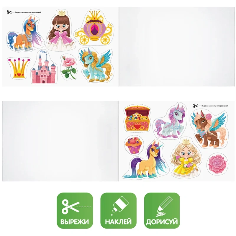 В альбоме представлены тематические элементы и персонажи (единороги и принцессы) для вырезания, которые можно использовать по отдельности или сразу вместе. Ребёнок может придумать сюжетную игру с рисунками и наклейками, украсить поделки, подарки для близких или детскую комнату. Размер ? 205*285 мм. Обложка изготовлена из импортного мелованного картона. Внутренний блок из 40 листов офсетной бумаги плотностью 100 г/кв. м, соответствует Техническому регламенту «О безопасности продукции, предназначенной для детей и подростков».
