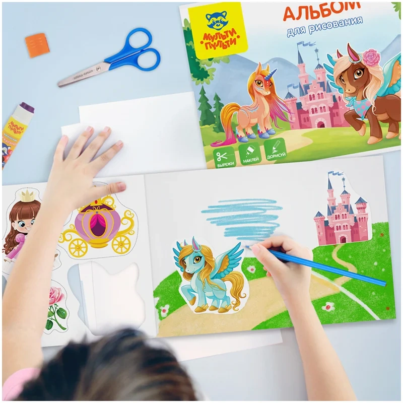 Альбом для рисования формата А4, на скобе, серия «Вырежи, наклей, дорисуй» ? время вырезать, наклеивать, придумывать яркие сюжеты, рисовать и раскрашивать.