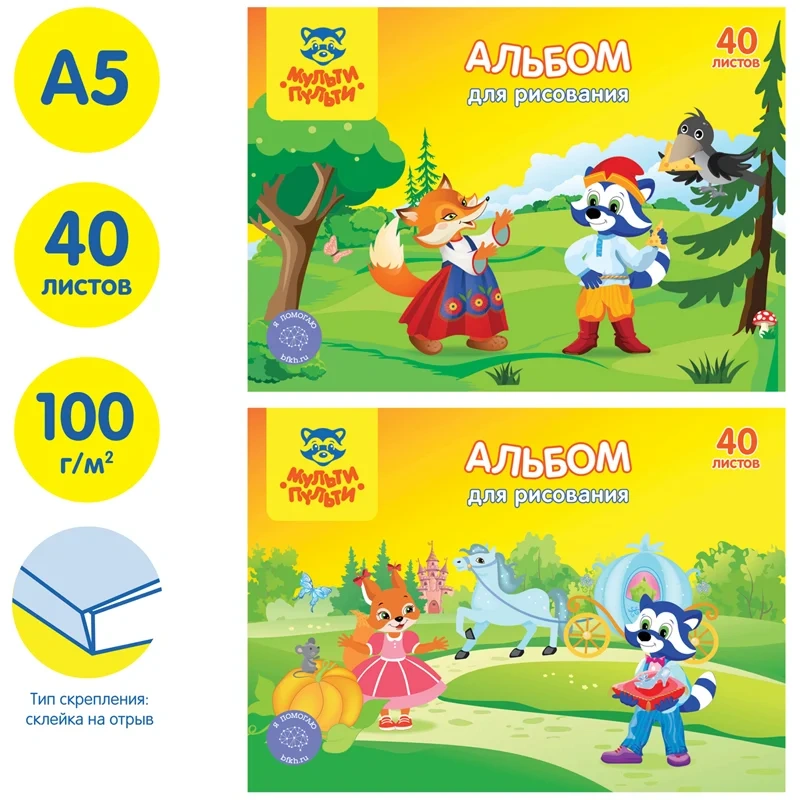 Альбом для рисования Мульти-Пульти формата А5 в картонной обложке. Состоит из 40 листов офсетной бумаги, тип скрепления - склейка. Плотность бумаги — 100 г/кв.м, соответствует Техническому регламенту «О безопасности продукции, предназначенной для детей и подростков». Подходит для рисования различными типами красок, фломастерами, цветными и чернографитными карандашами, гелевыми ручками. Без возрастных ограничений.