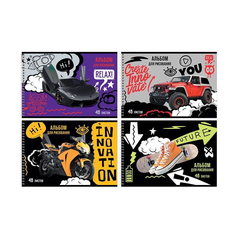 В упаковке ассорти стильных дизайнов альбомов, которые понравятся мальчикам. Альбом отлично подойдёт для рисования различными типами красок, фломастерами, цветными и чернографитными карандашами, гелевыми ручками. Не имеет возрастных ограничений.