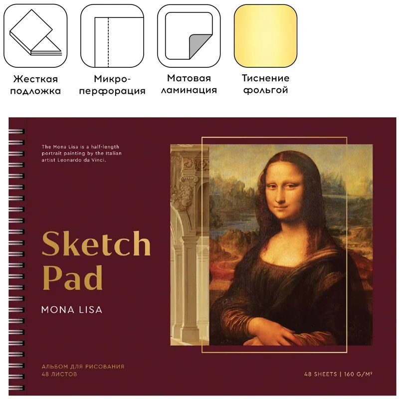Альбом отлично подойдёт для рисования различными типами красок, фломастерами, цветными и чернографитными карандашами, гелевыми ручками. Оригинальный дизайн обложки с отделкой матовой ламинацией и тиснением фольгой, посвященный творчеству художника Леонардо да Винчи.