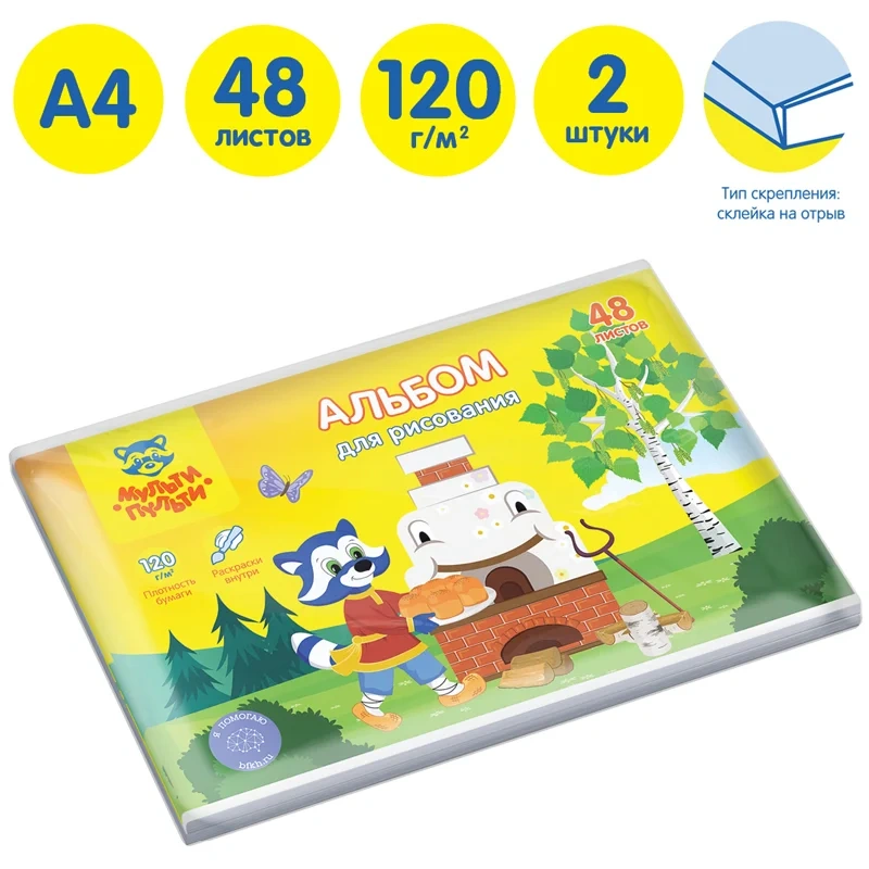 Комплект из двух альбомов для рисования Мульти-Пульти 'Приключения Енота' формата А4, на склейке, с раскраской. Комплект подойдет для больших любителей рисовать, групп творчества, детских садов или для семей, где несколько детей. Склейка позволяет беспроблемно отрывать листы из альбома, что может быть удобно для рисования в группах – каждому раздать по листу или, например, чтобы нарисованный сюжет повесить в рамку. Обложка альбомов изготовлена из импортного мелованного картона. На обороте обложки напечатаны картинки для раскрашивания. Внутренний блок из 48 листов офсетной бумаги плотностью 120 г/кв.м, соответствует Техническому регламенту «О безопасности продукции, предназначенной для детей и подростков». Подходит для рисования различными типами красок, фломастерами, цветными и чернографитными карандашами, гелевыми ручками. Без возрастных ограничений.