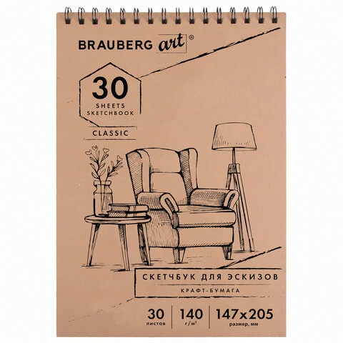 Альбом для рисования, крафт-бумага 140 г/м2, 147х205 мм, 30 л., спираль, BRAUBERG ART 'CLASSIC', 105