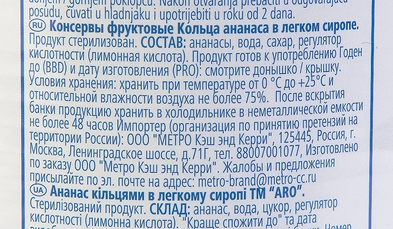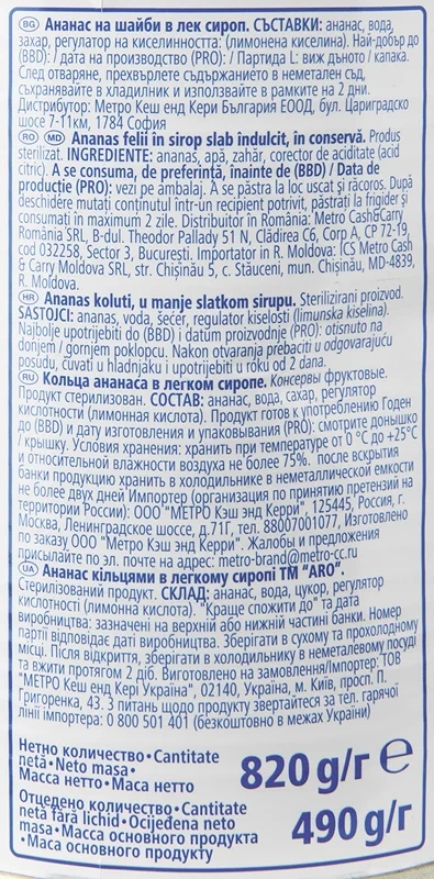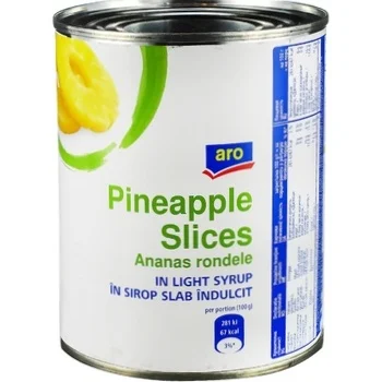 aro Ананасы кольца в легком сиропе, 820 г представляет собой натуральный продукт, который производится из свежих фруктов и концентрированного сахарного сиропа. Он отличается мягкостью, сочностью, ярко-выраженным вкусом с легкой кислинкой и приятным ароматом. В составе отсутствуют сахар, сахарозаменитель, фруктоза и глюкоза. Лакомство содержит большое количество витаминов, кальций и железо, полезных для организма человека. Его можно употреблять в натуральном виде или добавлять в разные блюда – салаты, холодные и горячие закуски. Консервированные ананасы могут выступать в качестве украшения к тортам, пирожным и другим кондитерским и хлебобулочным изделиям. Удобная форма нарезки экономит время и делает любое блюдо не только вкусным, но и аппетитным. Лакомство может прийтись по вкусу взрослым и детям. Выпускается в жестяной банке с ярким дизайном.