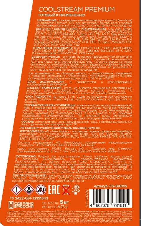 Антифриз Coolstream Premium Orange-Red, 4.73кг - антифриз на основе карбоксилатной технологии (Super Carboxylate technology), содержит первичный этиленгликоль высшего сорта, деминерализованную воду и сбалансированный пакет органических ингибиторов. Эффективно защищает от коррозии металлы и сплавы и обеспечивает устойчивую работу системы охлаждения при рабочих температурах от -40 C до +128 C. Обеспечивает долговременную защиту охлаждающей системы от замерзания, кипения, а также от коррозии и кавитации. Ресурс (продолжительность) использования данной охлаждающей жидкости в большинстве случаев равен сроку эксплуатации автомобиля - Extended Life Coolant. Этот эффект получен за счет уникального, точно дозируемого расхода пакета органических ингибиторов. Это флагманский карбоксилатный антифриз в линейке Coolstream (Super-OAT).