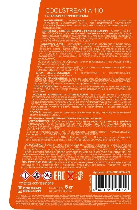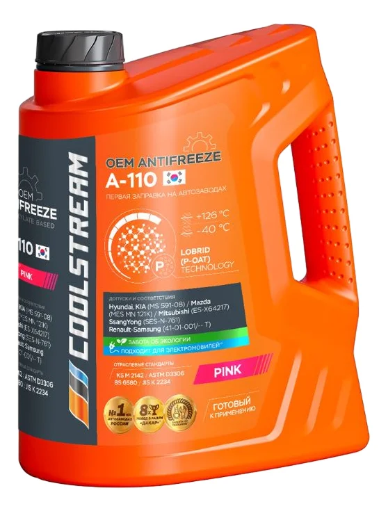 Антифриз Coolstream Premium Pink A-110, 4.7кг - лобридный антифриз, используемый для заправки (под иными торговыми названиями) в новые автомобили на заводах Hyundai и KIA по всему миру. Специально разработан под технические требования Hyundai-Kia, обладает официальным допуском Hyundai MS 591-08.